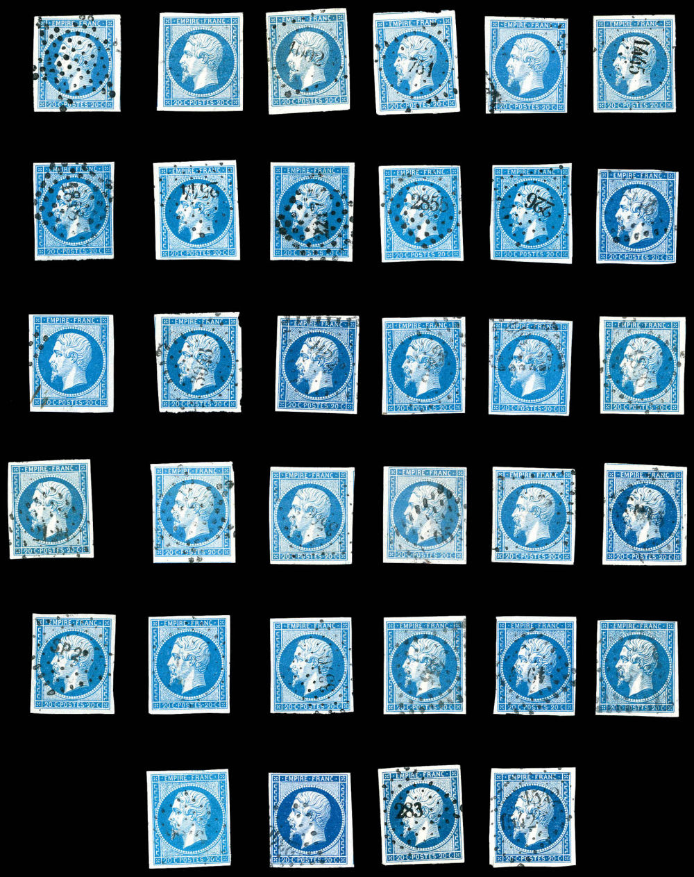 N°14, 20c Empire: très bel ensemble de 61 exemplaires choisis en majorité bord de feuille ou avec voisins. SUP Qualité: Oblitéré (Image)