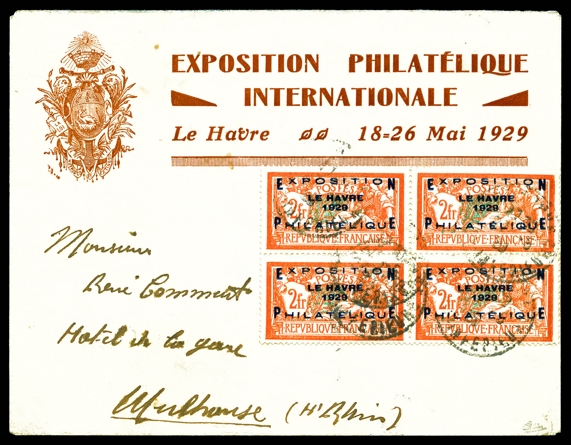 2581 imageN°257A, Exposition du Havre 1929 en bloc de quatre très bon centrage sur lettre de l'expo pour Mulhouse, SUP (signé Calves/certificat) Qualité: Oblitéré (Image)