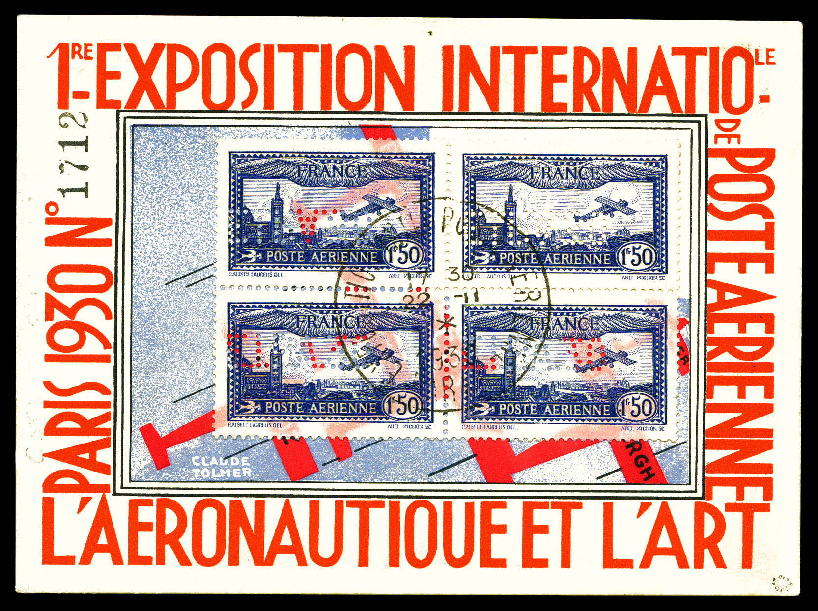 2583 imageN°6c, 1F50 outremer perforé 'E.I.P.A.30' en bloc de quatre sur carte de l'exposition avec texte orange, très jolie pièce. SUP (signé/certificat) Qualité: Oblitéré (Image)