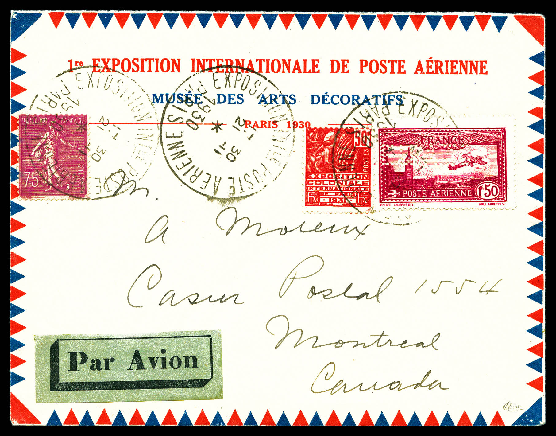 2585 imageN°6d, 1F50 carmin perforé E.I.P.A.30 obl spéciale de l'Expo de PA avec affranchissement complèmentaire sur lettre à destination du Canada. Très jolie pièce. R.R. (signé Calves/certificats) Qualité: Oblitéré (Image)