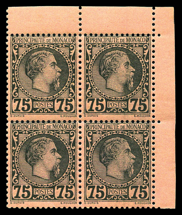 N°8, Charles III, 75c noir sur rose en bloc de quatre coin de feuille, fraîcheur postale, SUPERBE (signé Calves/certificat) Qualité: