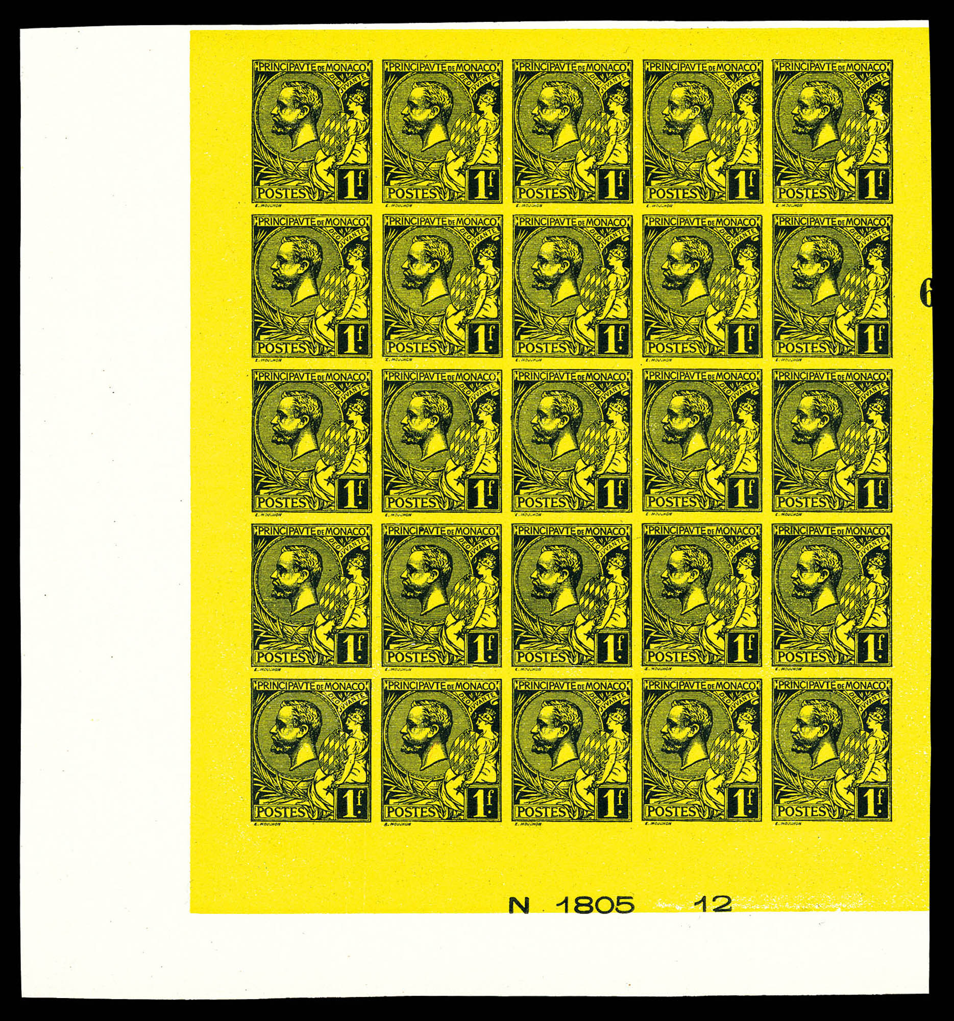 N°20b, Albert 1er, 1f noir sur jaune non dentelé (toujours sans gomme) en panneau de 25 exemplaires, bas de feuille avec numéro.