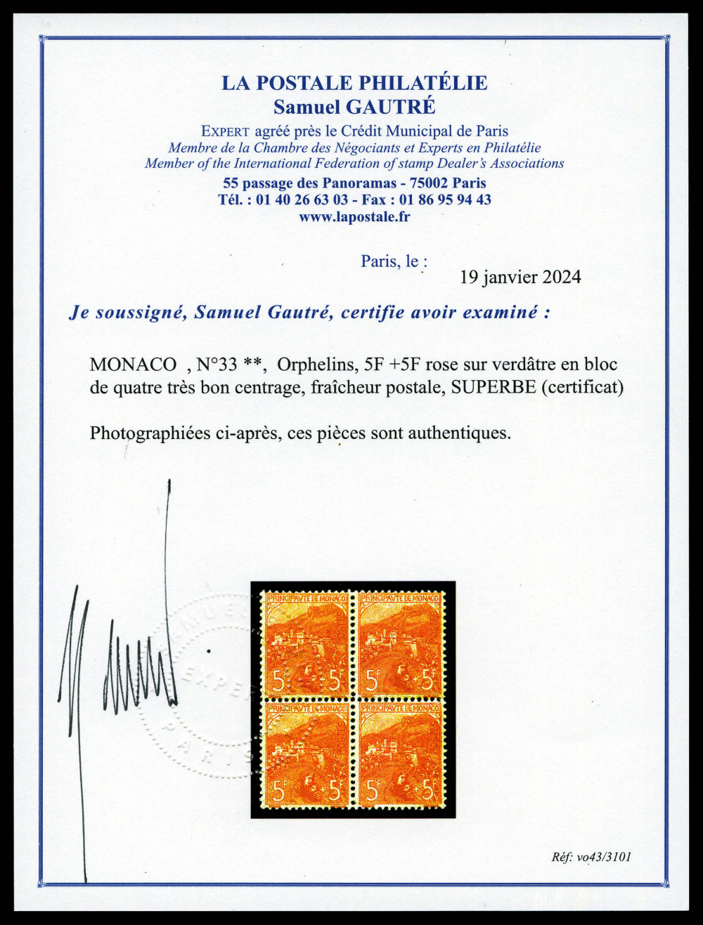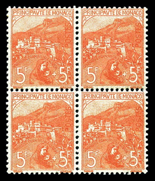 N°33, Orphelins, 5F +5F rose sur verdâtre en bloc de quatre très bon centrage, fraîcheur postale, SUPERBE (certificat) Qualité: **