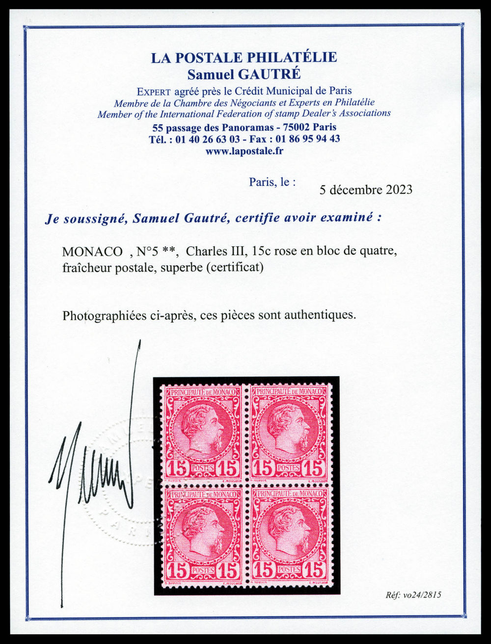 N°5, Charles III, 15c rose en bloc de quatre, fraîcheur postale, superbe (certificat) Qualité: ** (Image) (imagea)