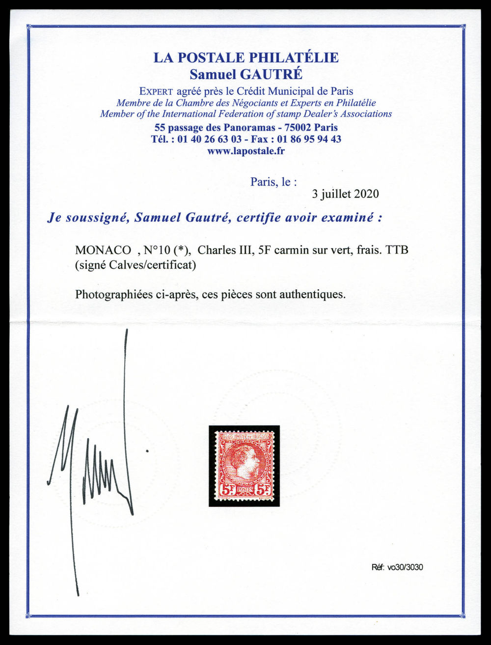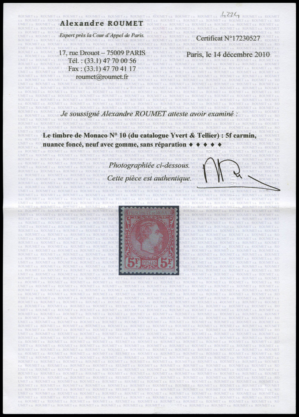 N°10, Charles III, 5F carmin sur vert, frais. TTB (signé Calves/certificat) Qualité: (*) Cote: 4500 euros (Image) (imagea)
