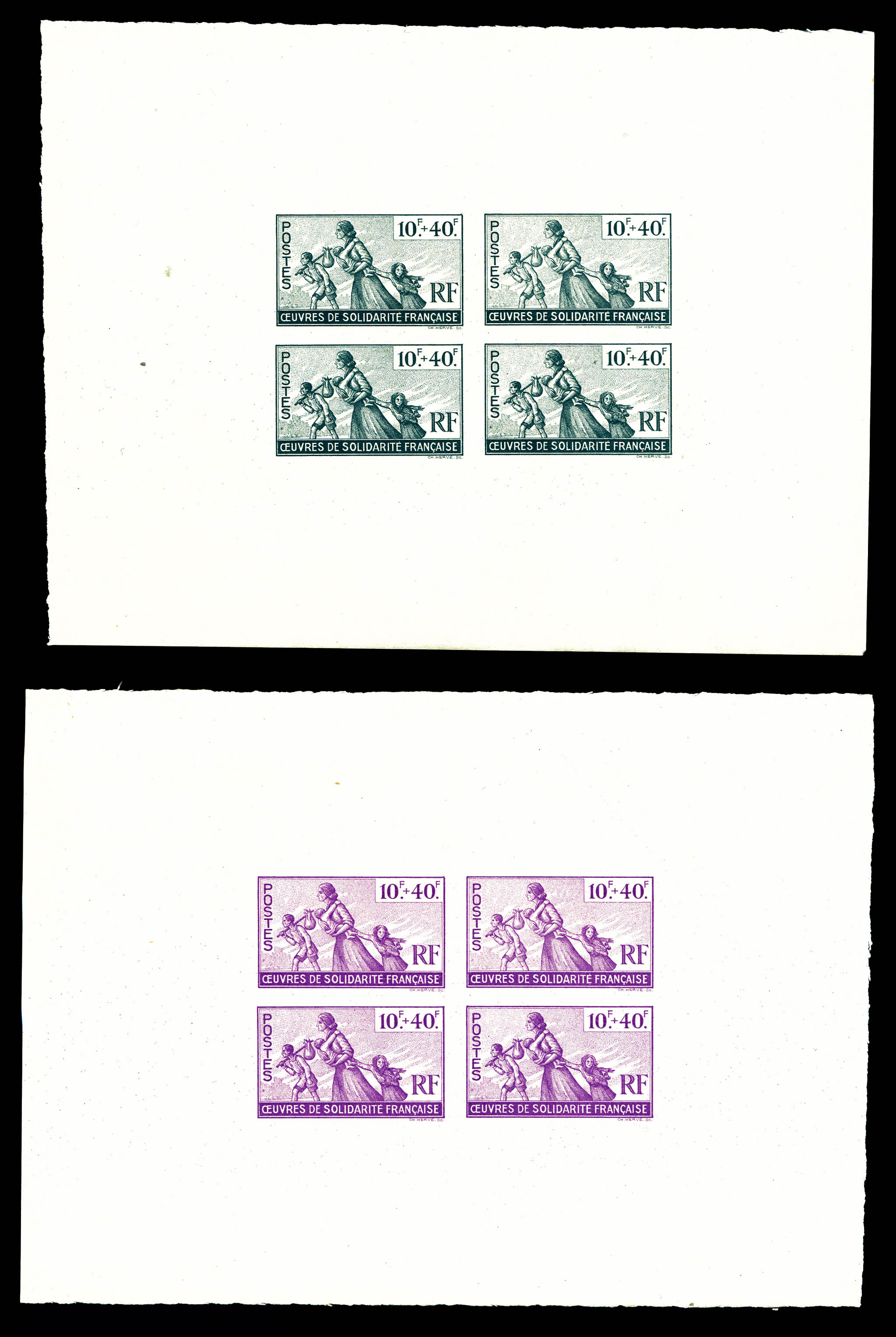2682 nh imageFRANCE LIBRE N°7, Oeuvres de Solidarité Francaise, bloc de quatre sur feuillet gommé: 4 exemplaires avec couleurs différentes. SUP. R. (certificat) Qualité: ** (Image)