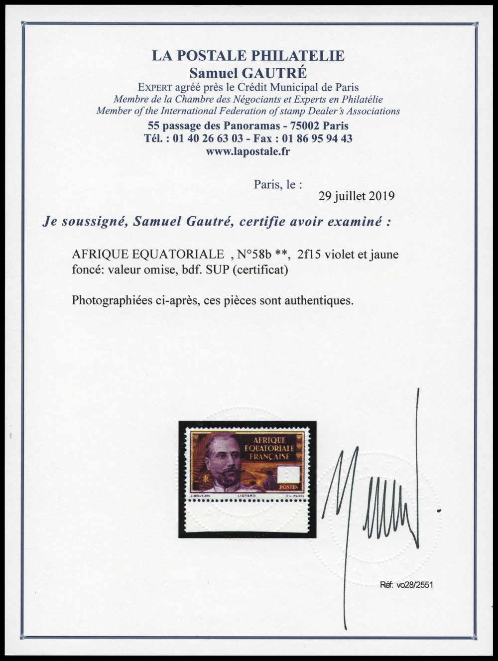 2700 nh imageN°58b, 2f 15 violet et jaune foncé, valeur omise bdf. TTB (certificat) Qualité: ** Cote: 480 euros (Image) (imagea) (All Images)
