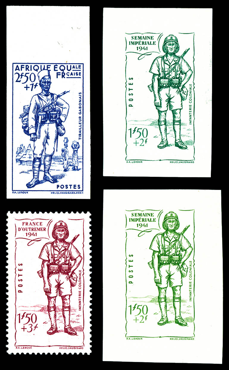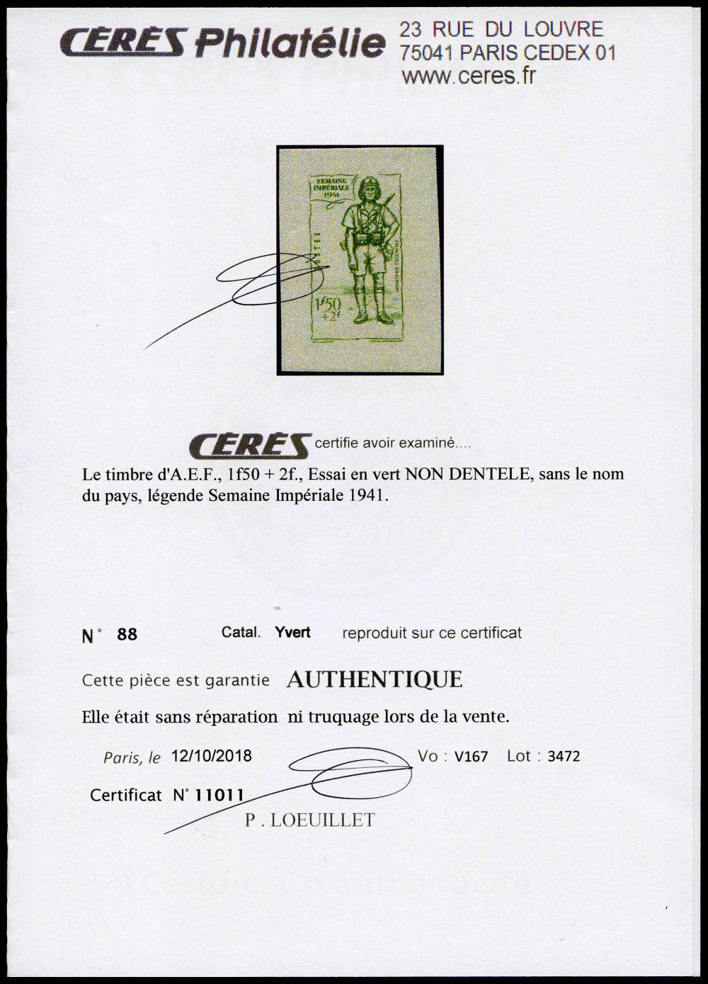 N°88, 1f 50 +3f: sans nom du territoire + 2 essais non dentelé en vert et vert-jaune sans légende et N°89a, les 3 valeurs SUP