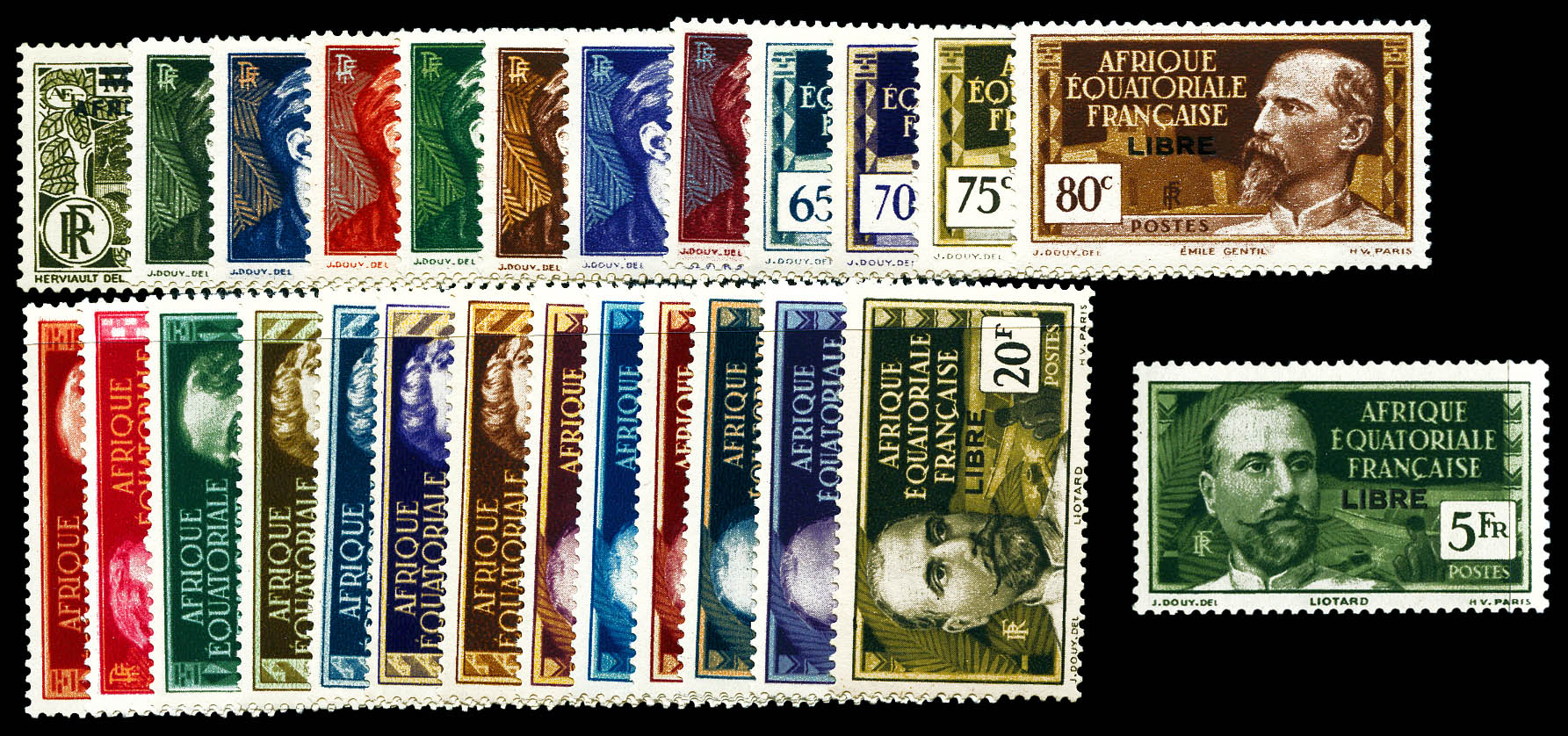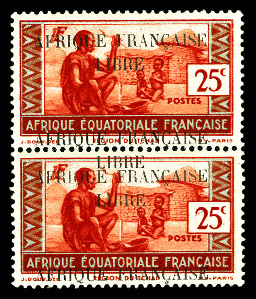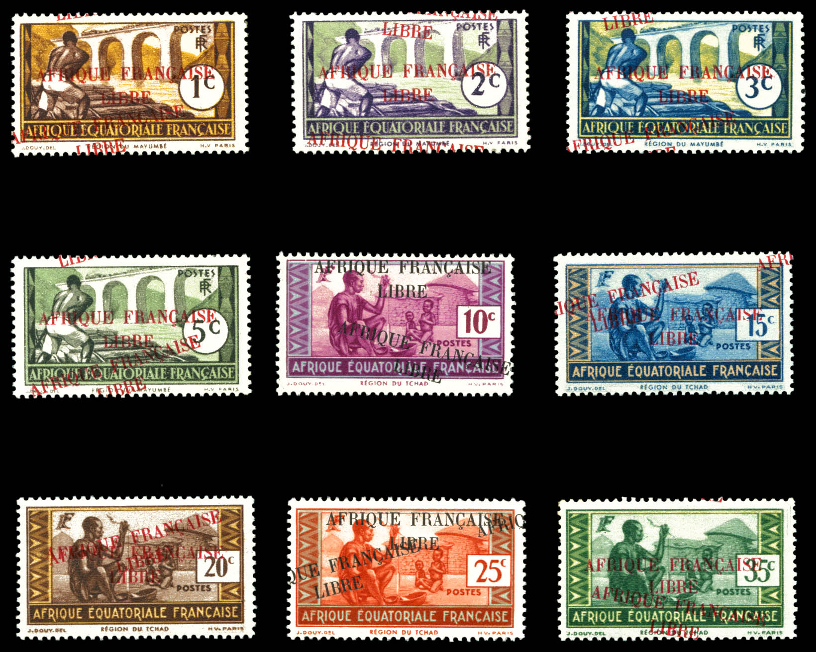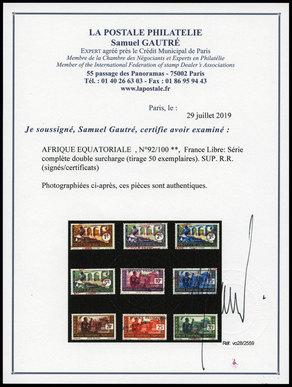 N°92b/100b, France Libre: Série complète double surcharge dont une oblique (tirage 50 exemplaires). Les 9 valeurs SUPERBE. R.R.