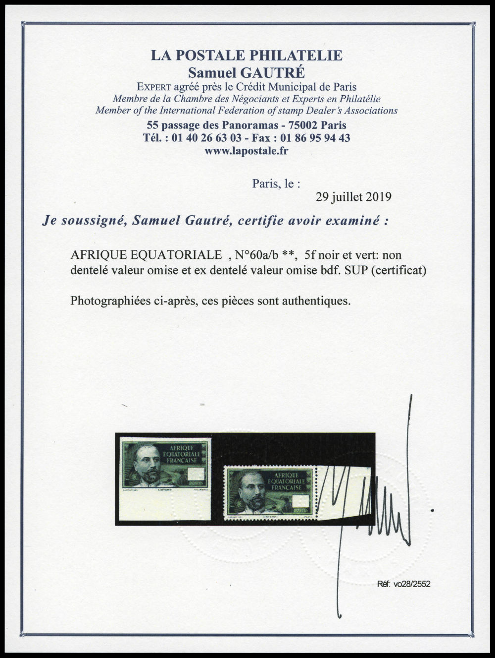 N°60b, 5f noir et vert, dentelé, valeur omise bdf. TTB Qualité: ** Cote: 500 euros (Image) (imagea)