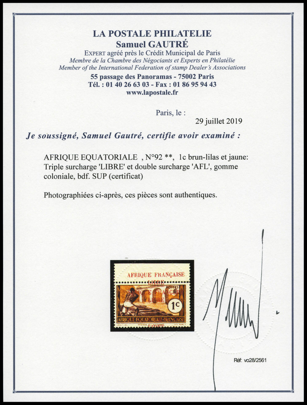 N°92, 1c brun-lilas et jaune: Triple surcharge 'LIBRE' et double surcharge 'AFL', gomme coloniale, bdf. SUP (certificat) Qualité: