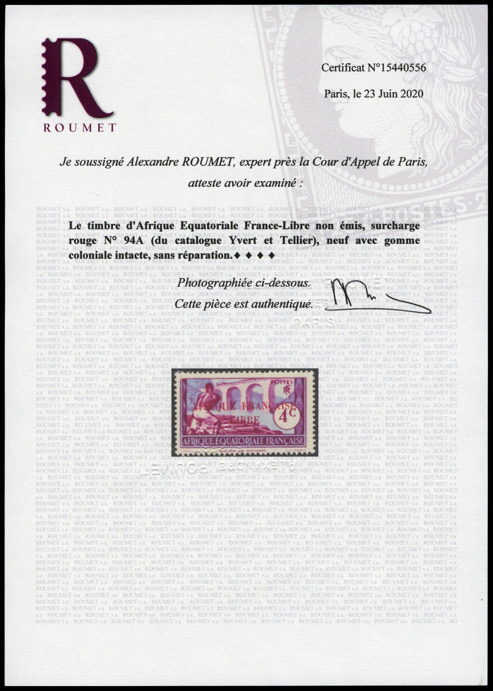 N°94A, Non émis, 4c grenat et bleu-clair. SUP. R. (certificat) Qualité: * Cote: 550 euros (Image) (imagea)