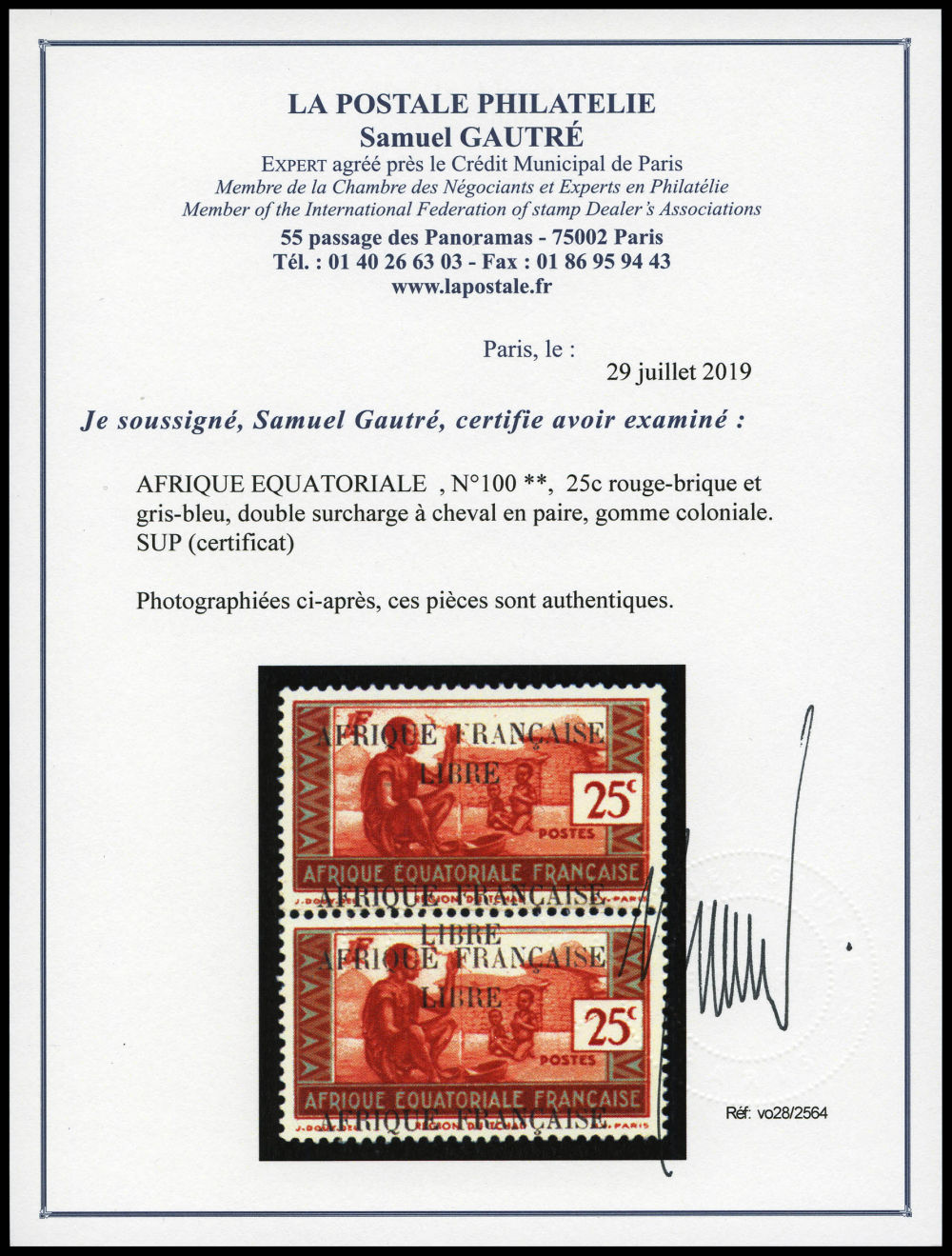 N°99a, 25c rouge-brique et gris-bleu: Double surcharge dont une à cheval sur paire, gomme coloniale. TTB. R. (certificat) Qualité: