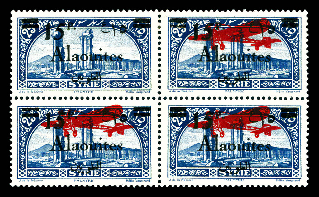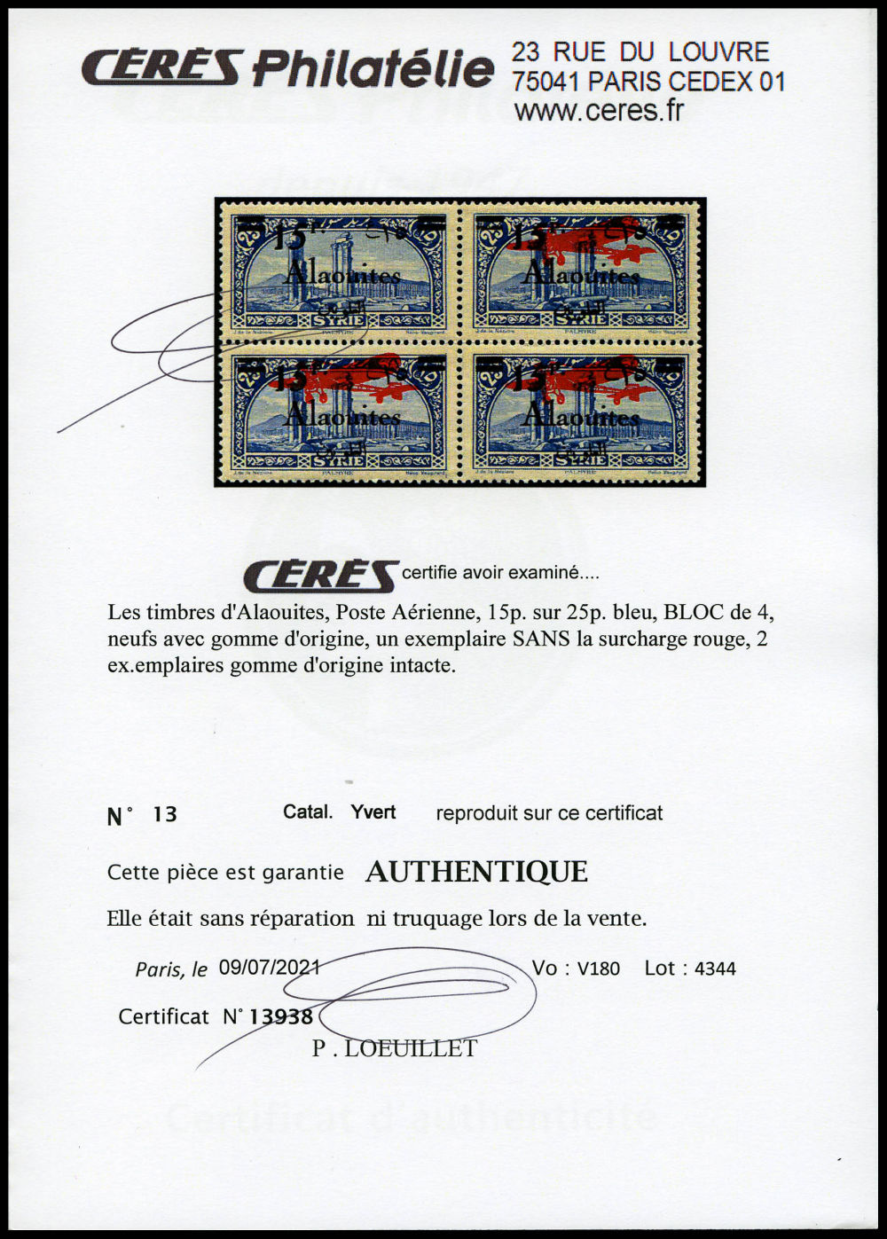 2822 og imageN°13, 15 pi sur 25 pi bleu: exemplaire sans la surcharge Avion en rouge tenant à normaux en bloc de quatre (non catalogué). SUP. R. (certificat) Qualité: * (Image) (imagea) (All Images)