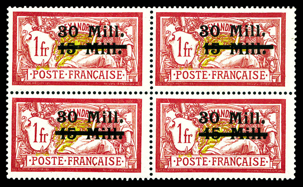 2855 nh imageN°19a, 40c Merson, surcharge à cheval sur bloc de 4 bas de feuille +3c blanc surcharge à cheval (n°3a). SUP (certificat) Qualité: ** Cote: 660 euros (Image) (imagea) (All Images)