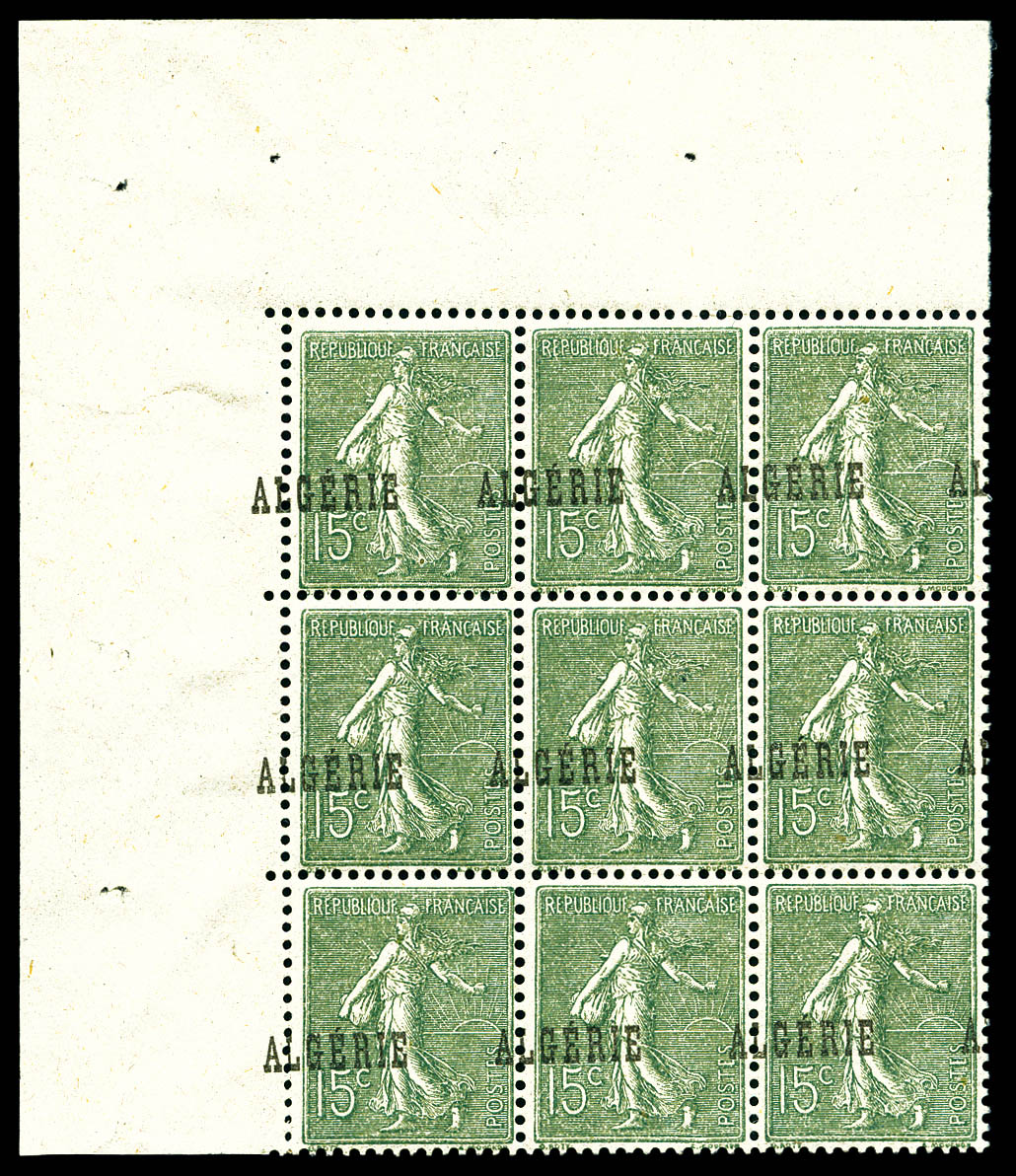 2852 nh imageN°10a, 15c Semeuse: surcharge à cheval sur bloc de 9 coin de feuille. SUP (certificat) Qualité: ** Cote: 900 euros (Image)