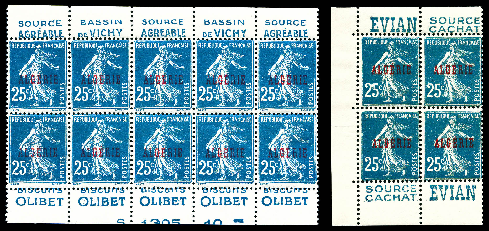 2854 nh imageN°14b, 25c Semeuse avec bandes pub: bd4 'EVIAN' et bd10 'VICHY/OLIBET. TB Qualité: ** Cote: 420 euros (Image)