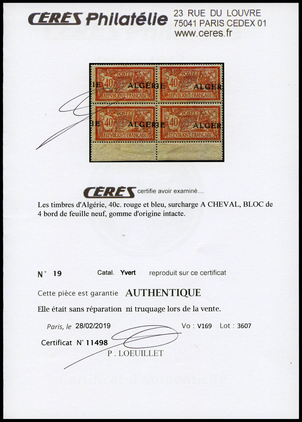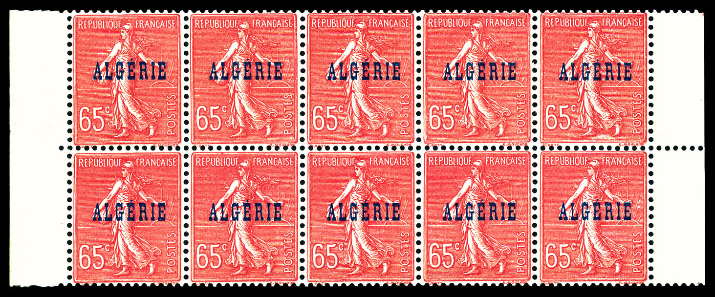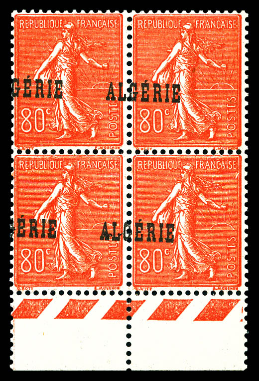 2860 nh imageN°27a, 80c Semeuse: Surcharge ALGERIE à cheval sur bloc de quatre. TTB (certificat) Qualité: ** Cote: 420 euros (Image)