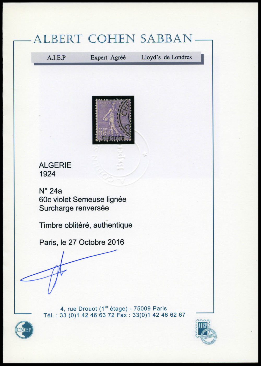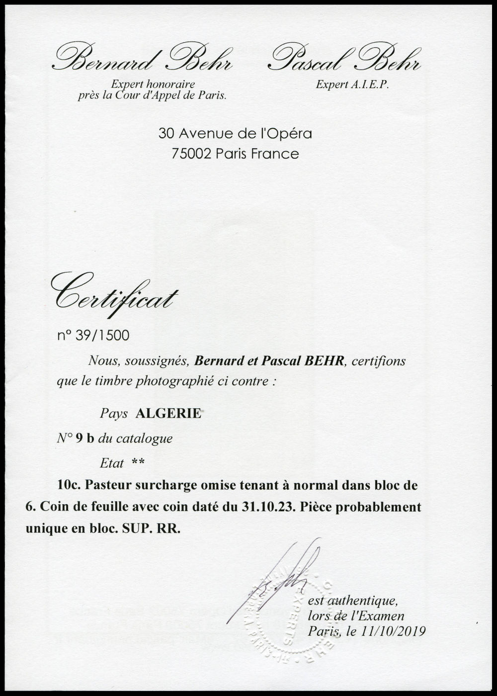2859 og image75c Pasteur: Double surcharge ALGERIE. SUP (signé Brun/certificat) Qualité: * Cote: 475 euros (Image)