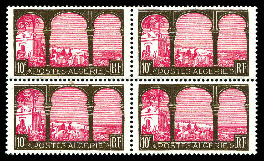 N°84c, 10f brun et rosé: Arbre coupé tenant à normaux en bloc de quatre cdf. SUP. R. (certificat) Qualité: ** Cote: 1794 euros (Image)