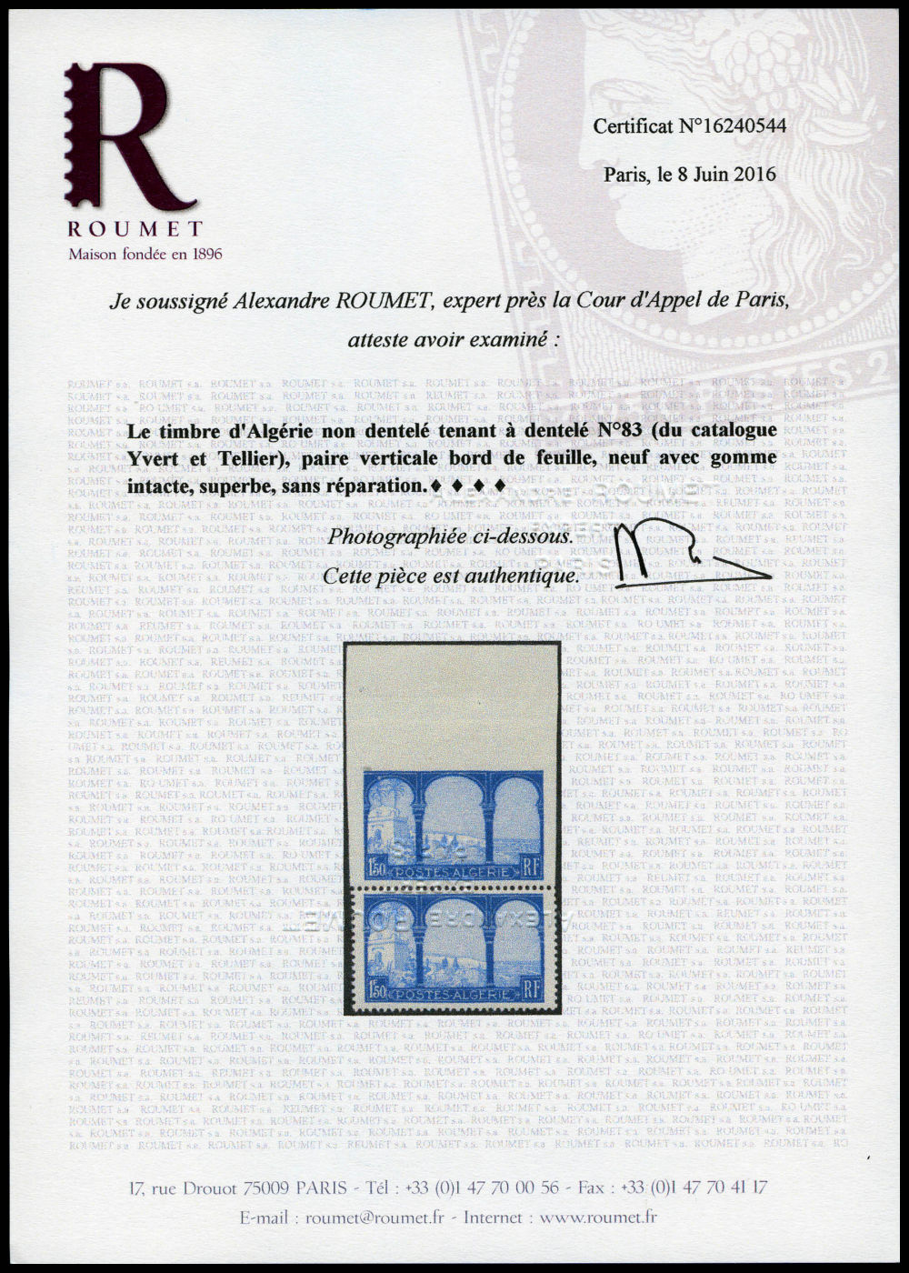 N°83aa, 1f 50 bleu foncé et bleu: Non dentelé tenant à normal. SUP. R.R.R. (signé Calves/certificat) Qualité: ** Cote: 7800 euros (Image) (imagea)