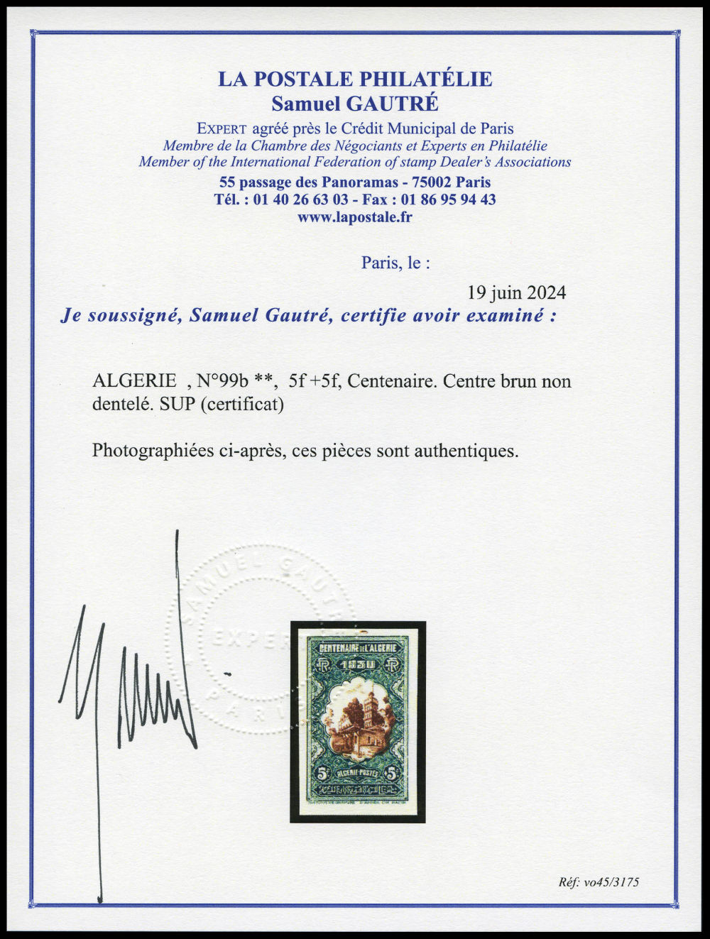 N°99ba, 5f +5f, Centenaire. Centre brun non dentelé. SUP (certificat) Qualité: ** Cote: 1250 euros (Image) (imagea)