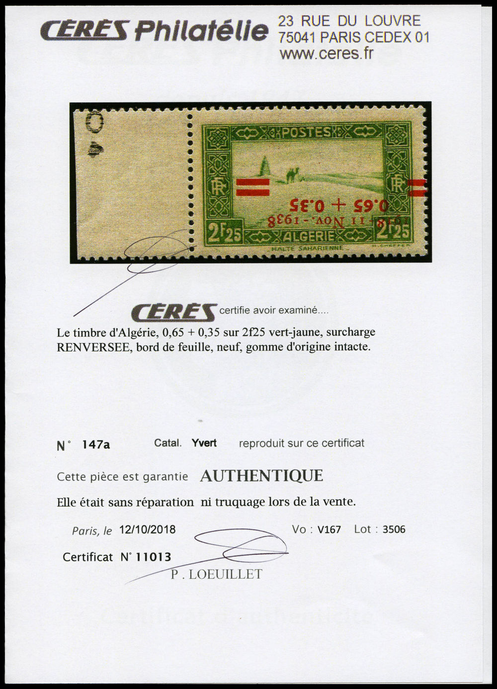 N°147a, 0.65 + 0.35 sur 2f 25 vert-jaune: surcharge renversée, bdf. SUP (signé Brun) Qualité: ** Cote: 600 euros (Image) (imagea)