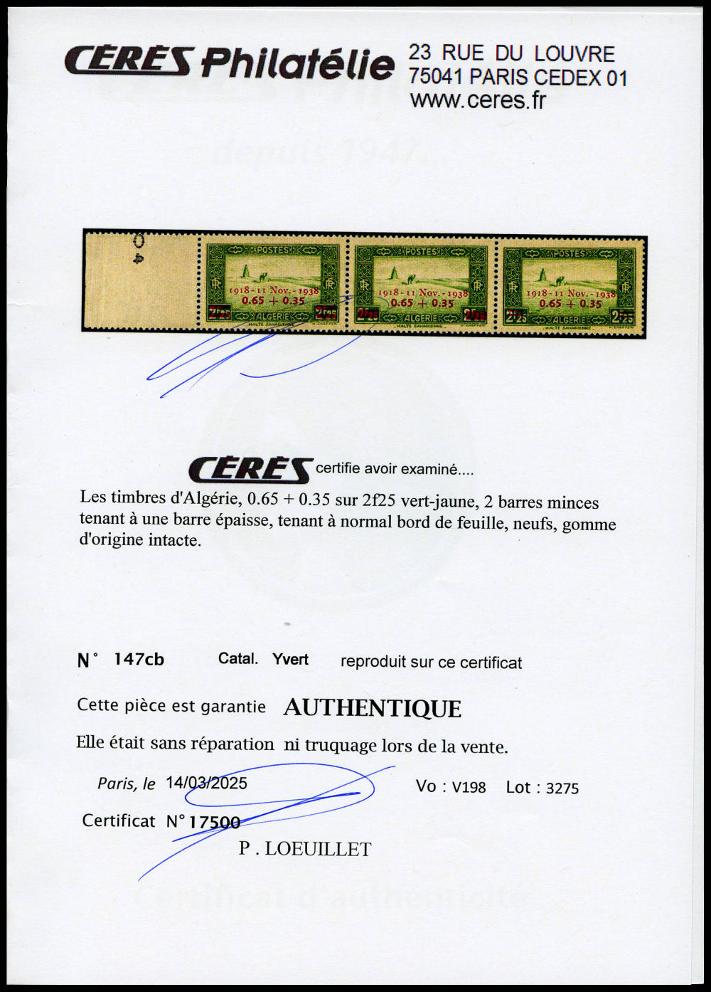 N°147cb, Surcharge avec 2 barres minces tenant à surcharge avec barre épaisse tenant à normal en bande de 3 bdf (signé Brun)