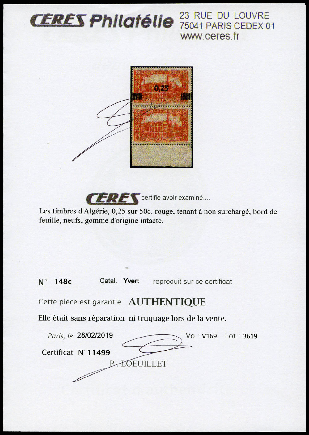 N°148, 25c sur 50c rouge: surchargé tenant à non surchargé en paire bdf (non catalogué). TTB (signé Brun/certificat) Qualité: * (Image) (imagea)