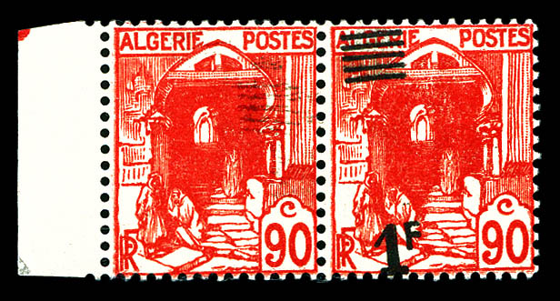 N°158c, 1f sur 90c rouge type I: surcharge à cheval tenant à non surchargé en paire bdf. SUP (signé Brun/certificat) Qualité: **