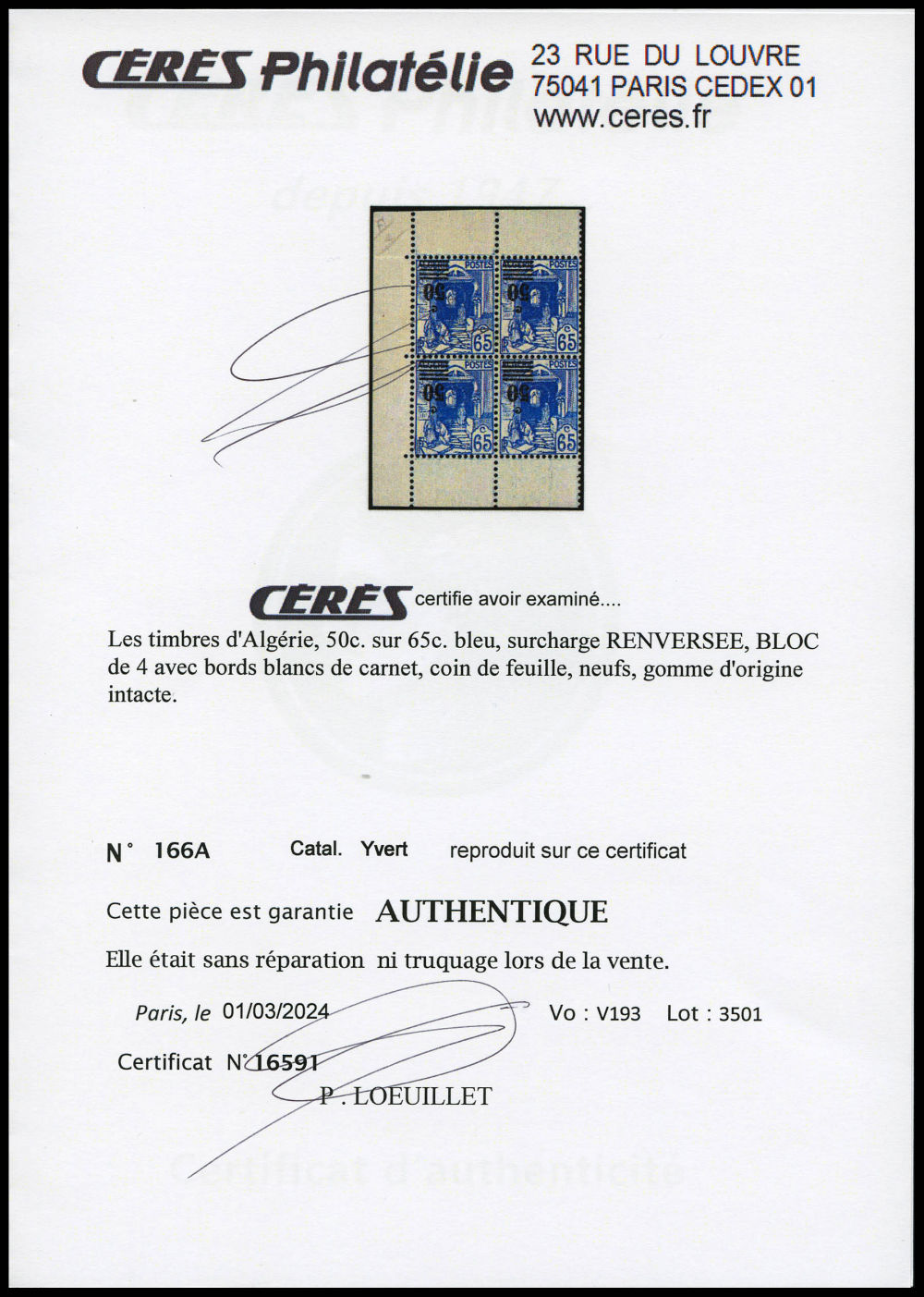 N°166a, 50c sur 65c bleu: surcharge renversée sur bd4 de carnet. TTB (certificat) Qualité: ** Cote: 640 euros (Image) (imagea)