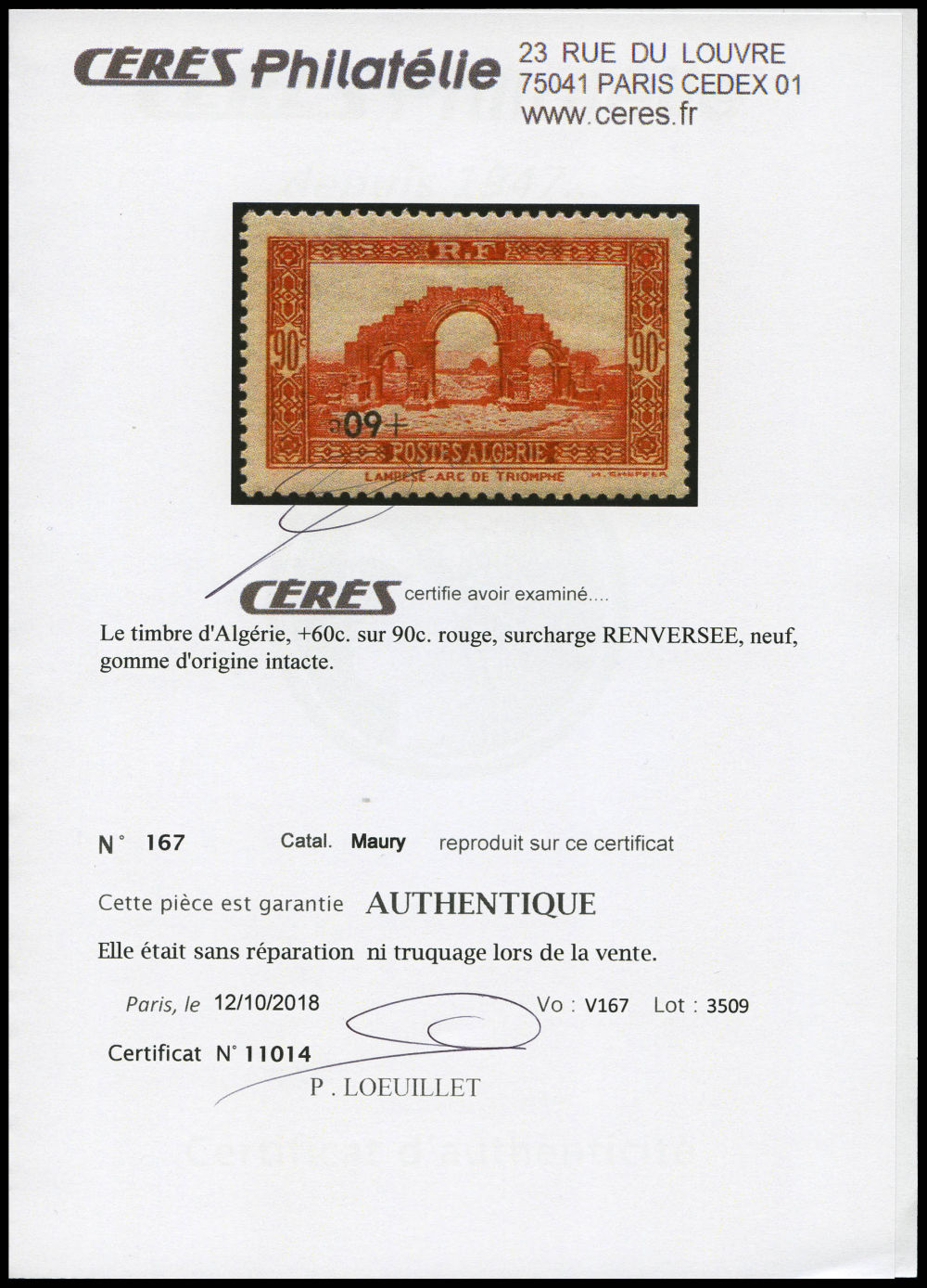 N°167c, +60c sur 90c rouge: Surcharge renversée. TTB (signé Brun) Qualité: ** Cote: 400 euros (Image) (imagea)