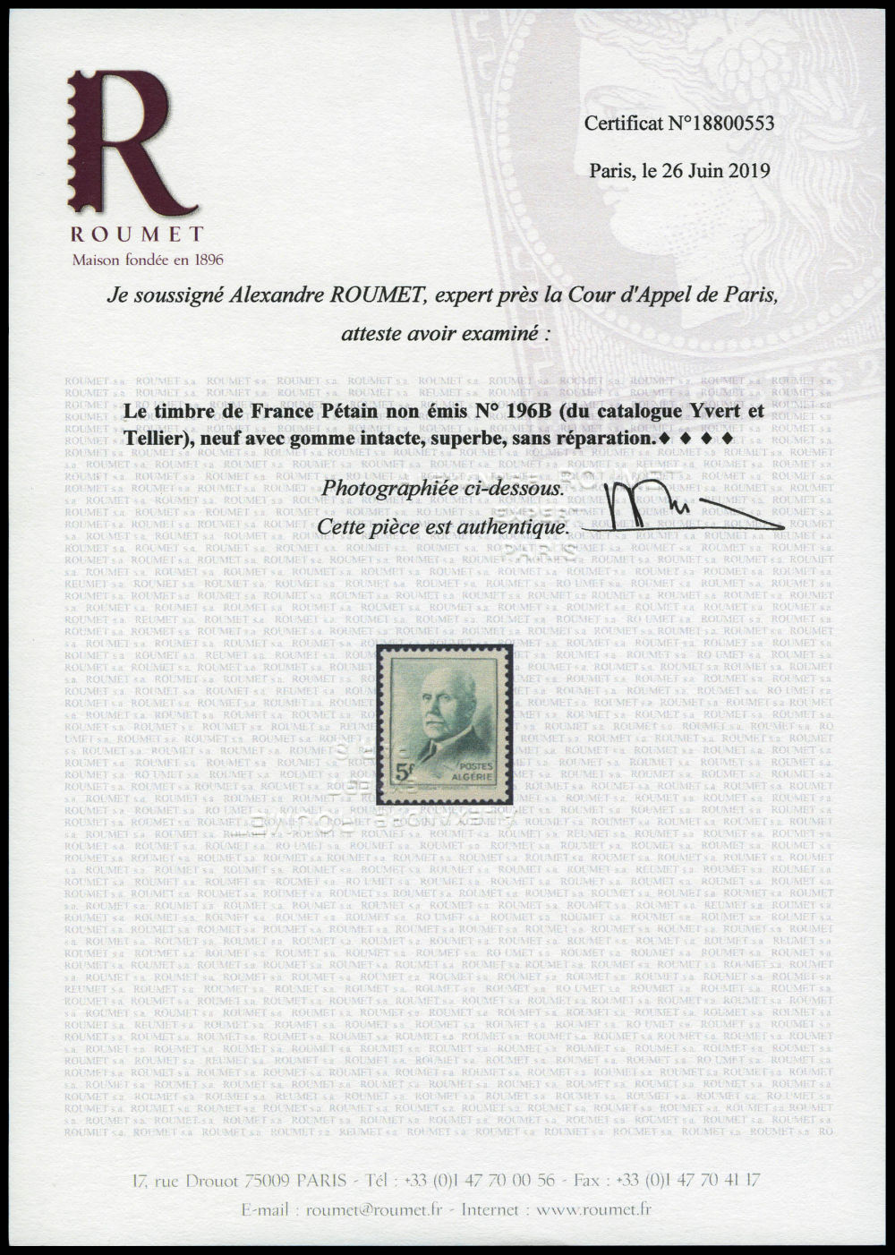 N°196B, NON EMIS, 5f vert. SUP. R.R. (signé/certificat) Qualité: ** Cote: 2000 euros (Image) (imagea)