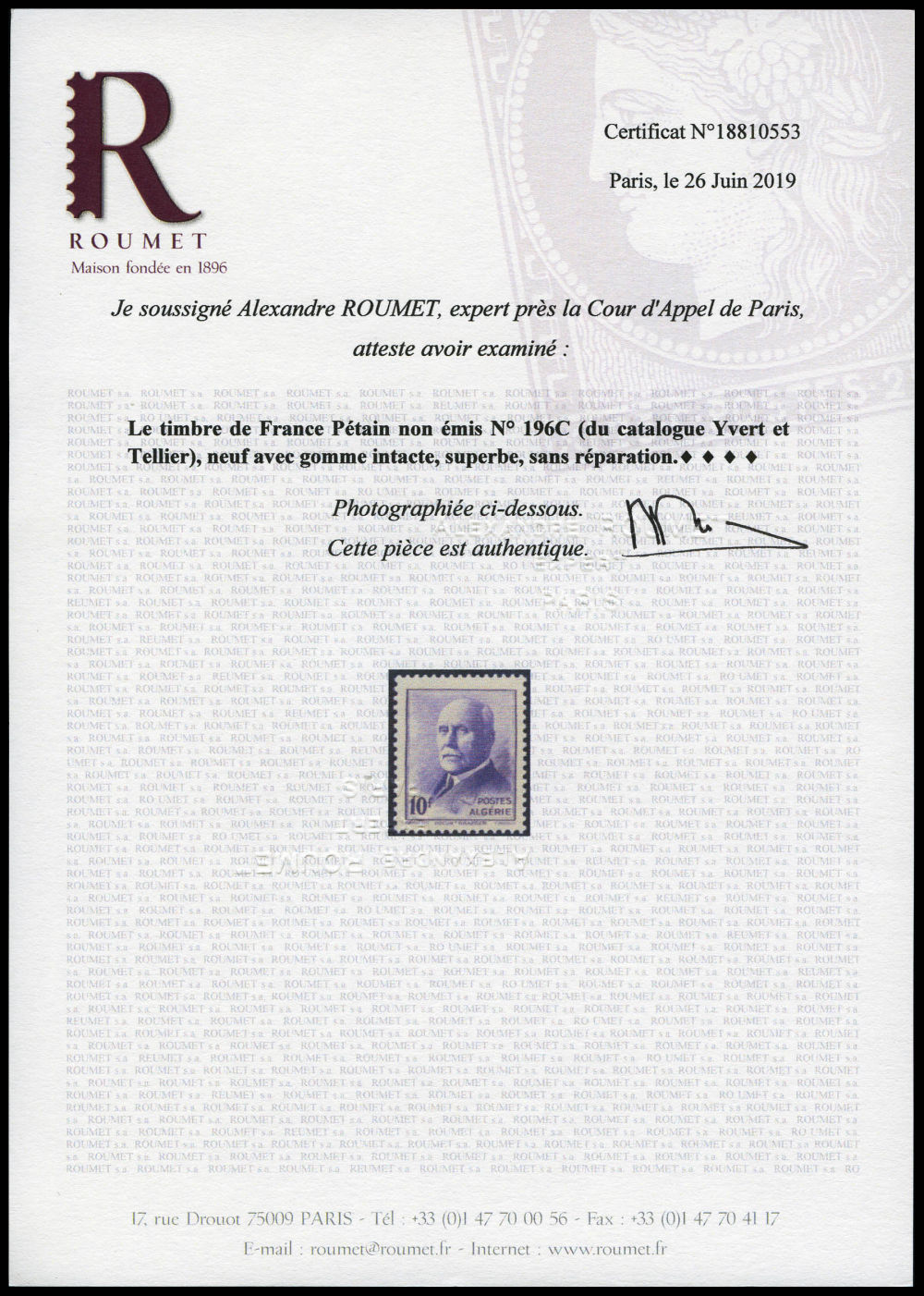 N°196C, NON EMIS, 10f violet. SUP. R.R. (certificat) Qualité: ** Cote: 1000 euros (Image) (imagea)