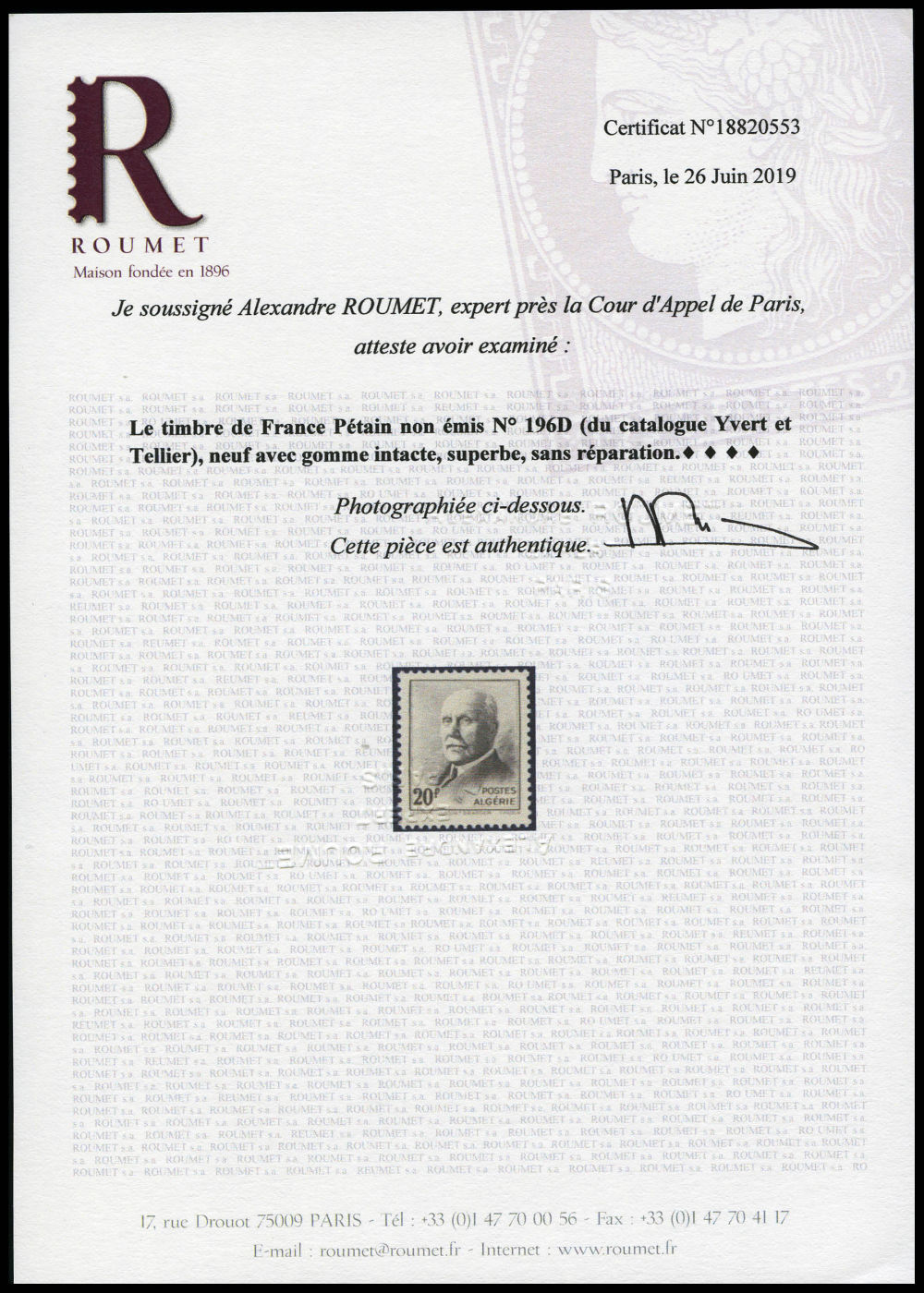 N°196D, NON EMIS, 20f gris-noir. SUP. R.R. (signé/certificat) Qualité: ** Cote: 1000 euros (Image) (imagea)