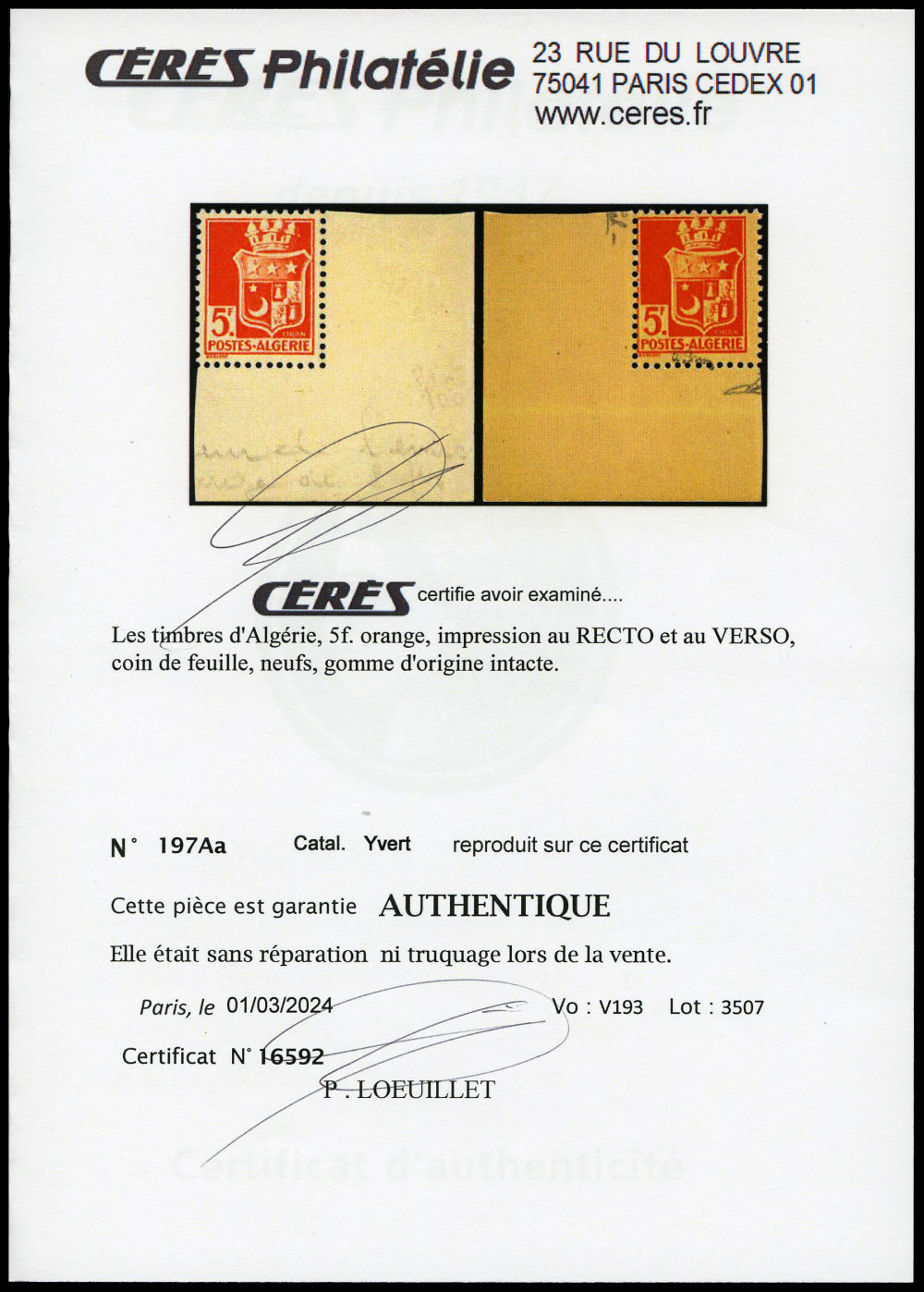N°197ba, 2f sur 5f rouge orange: Double surcharge non dentelé, bdf. SUP (signé Brun/certificat) Qualité: ** Cote: 850 euros (Image)