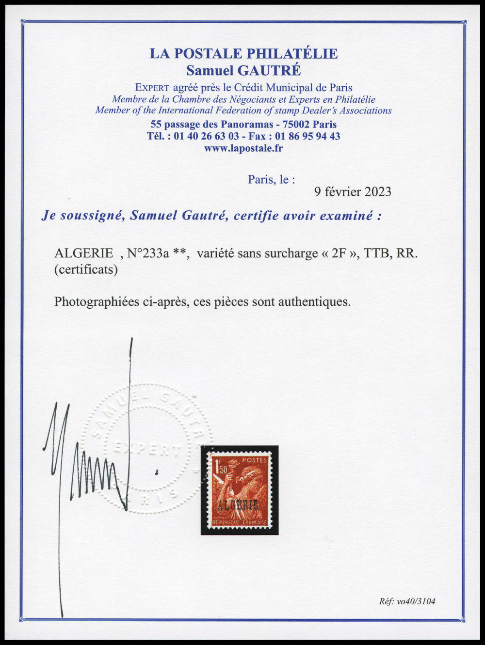 N°233a, variété sans surcharge « 2F », TTB, RR. (certificats) Qualité: ** Cote: 570 euros (Image) (imagea)
