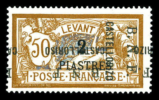 N°11, 2 pi sur 50c brun et gris: Triple surcharge dont 2 horizontales renversées et à cheval dont variété 'S' au lieu de 'Z' dans