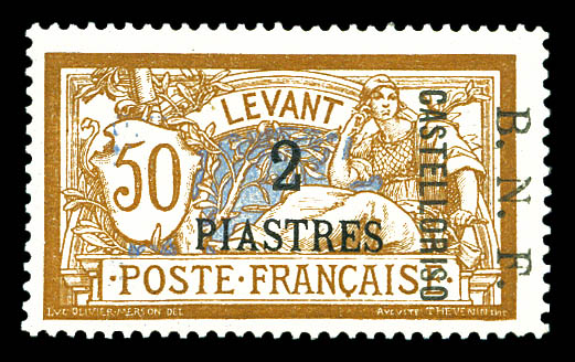 N°11, 2 pi sur 50c brun et gris: Triple surcharge dont 2 horizontales renversées et à cheval sans B.N.F et variété 'S' au lieu de 'Z'