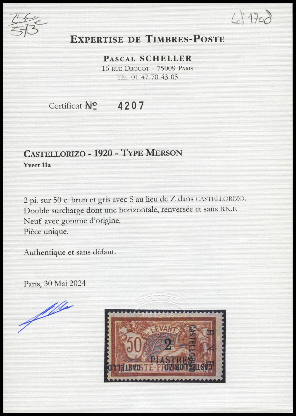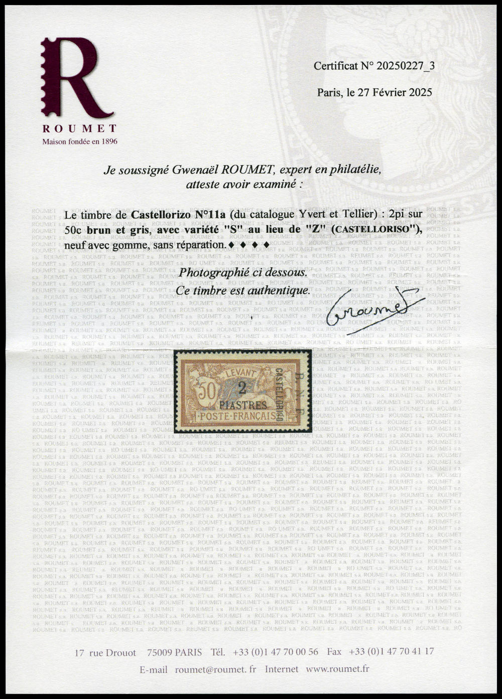 N°11a, 2 pi sur 50c brun et gris, variété 'S' au lieu de 'Z' dans CASTELLORIZO. TTB (signé Brun/certificats) Qualité: * Cote: 790