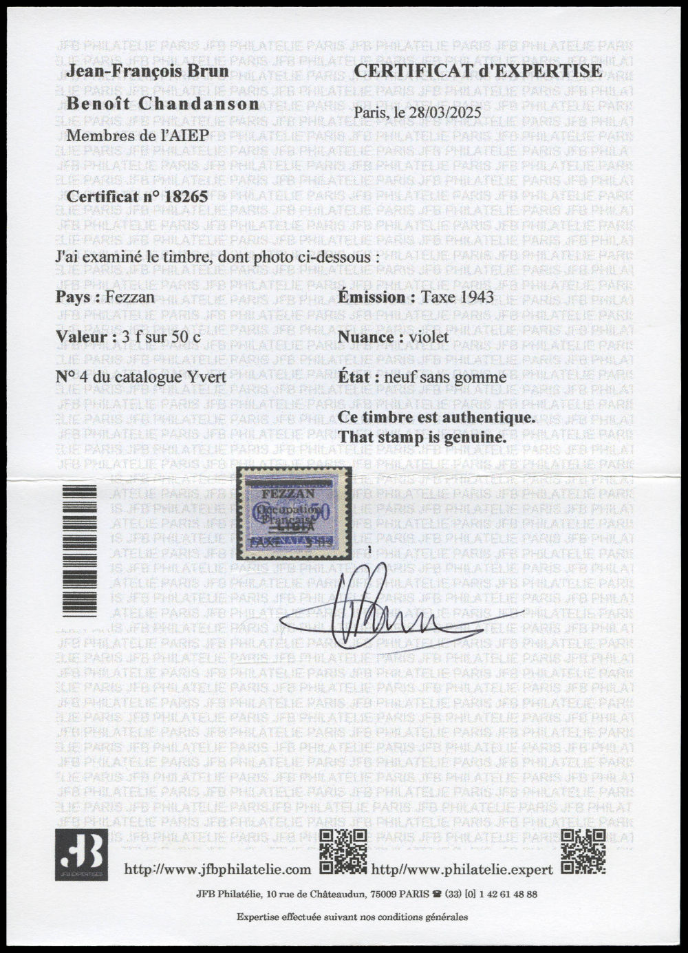 3155 og imageN°4, 3f sur 50c violet, frais. SUP. R. (signé Brun/Bollafi/Diena/certificat) Qualité: * Cote: 2625 euros (Image) (imagea) (All Images)
