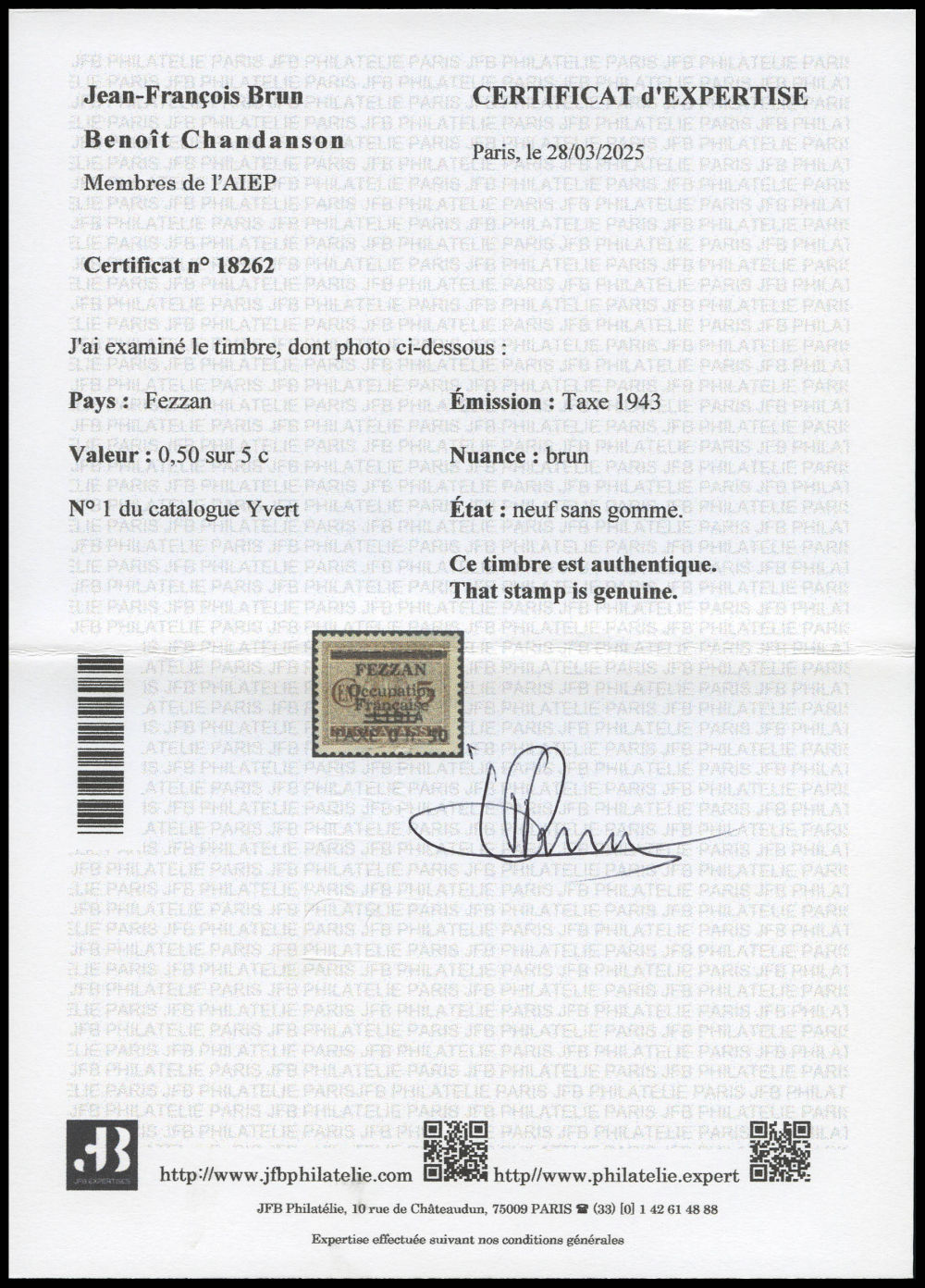 3150 og imageN°1, 0.50 sur 5c brun, quasi **. SUP. R. (signé Brun/Bollafi/Diena/certificat) Qualité: * Cote: 2625 euros (Image) (imagea) (All Images)