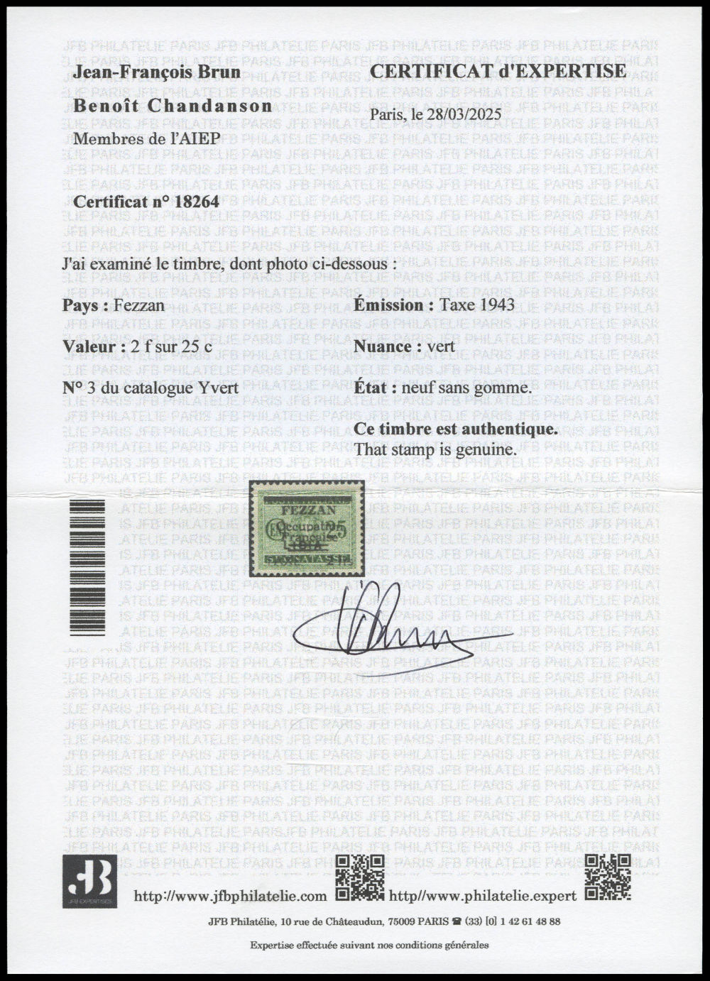3154 og imageN°3, 2f sur 25c vert, quasi **. SUP. R. (signé Brun/Bollafi/Diena/certificat) Qualité: * Cote: 2625 euros (Image) (imagea) (All Images)