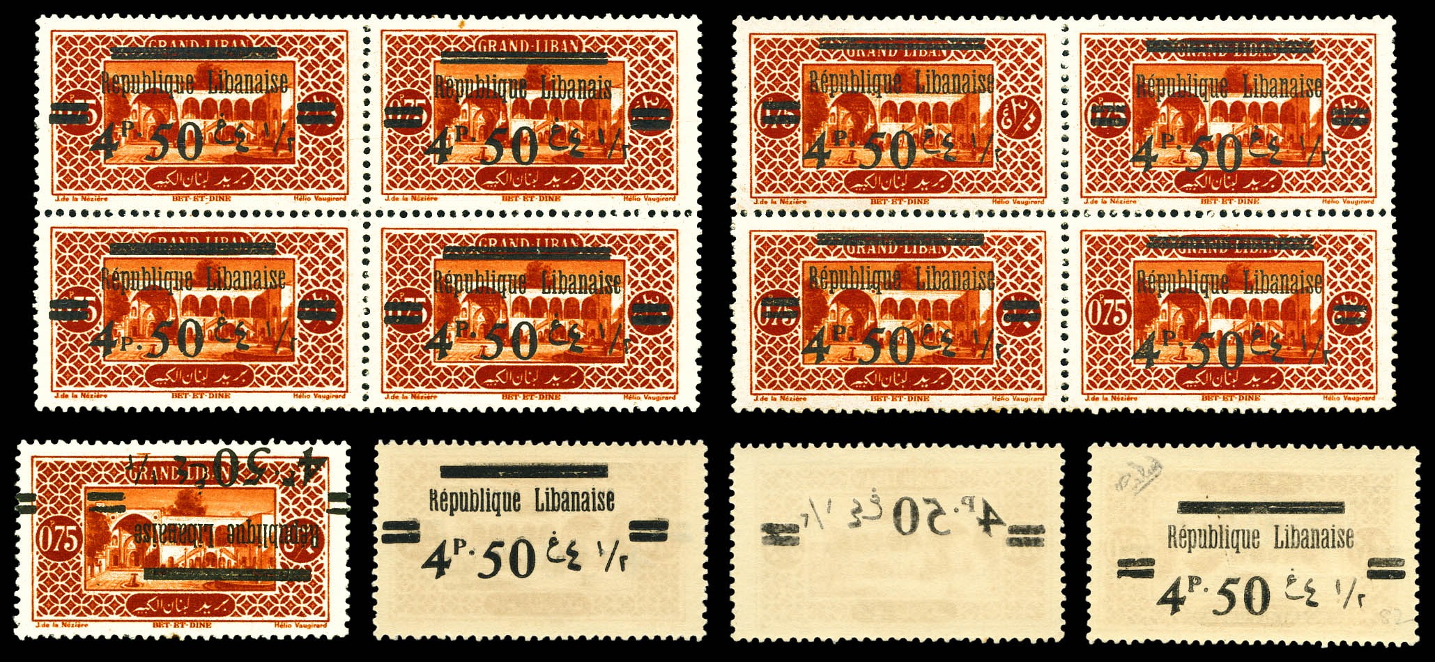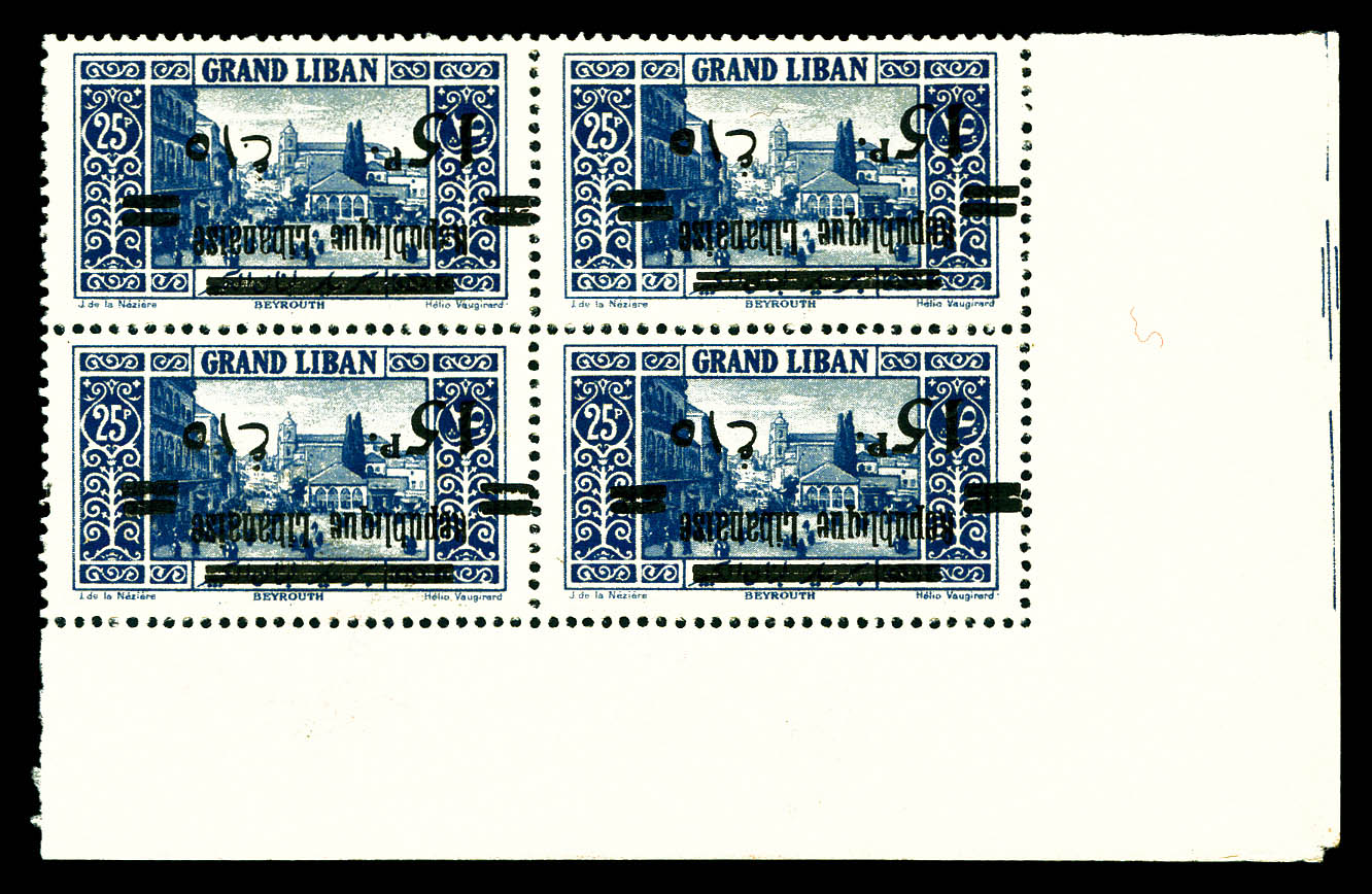 N°96d, 15pi sur 25pi bleu, variété surcharge renversée, bloc de 4 cdf, TTB. (Signé Scheller/certificat) Qualité: ** Cote: 960