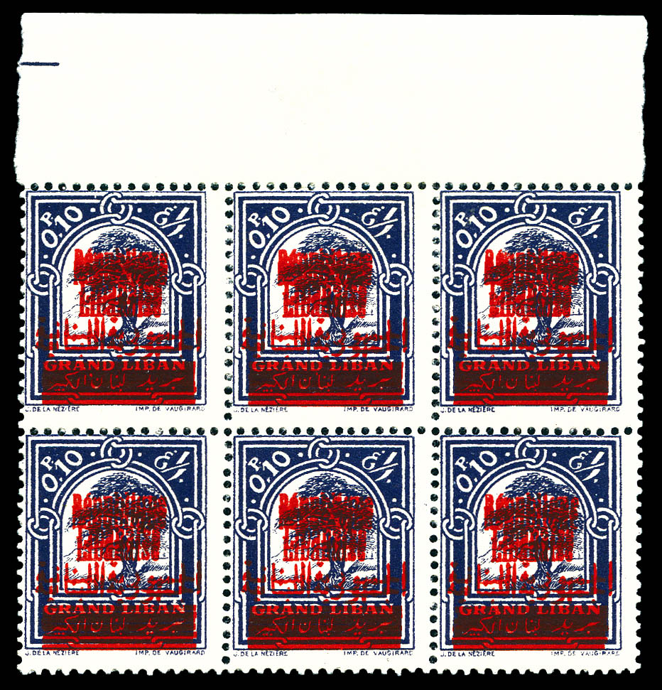 N°98aa, 0.10 pi violet: double surcharge en bloc de 6 haut de feuille. SUP (certificat) Qualité: ** Cote: 930 euros (Image) (imagea)