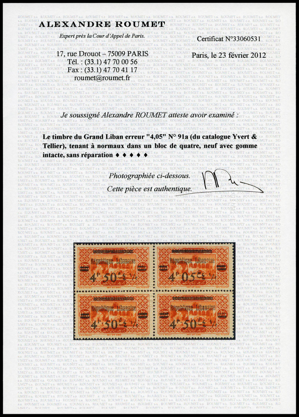 N°91aa, Erreur: '4 P 05' au lieu de '4 P 50' tenant à normaux en bloc de 4. TTB (certificat) Qualité: ** Cote: 665 euros (Image) (imagea)