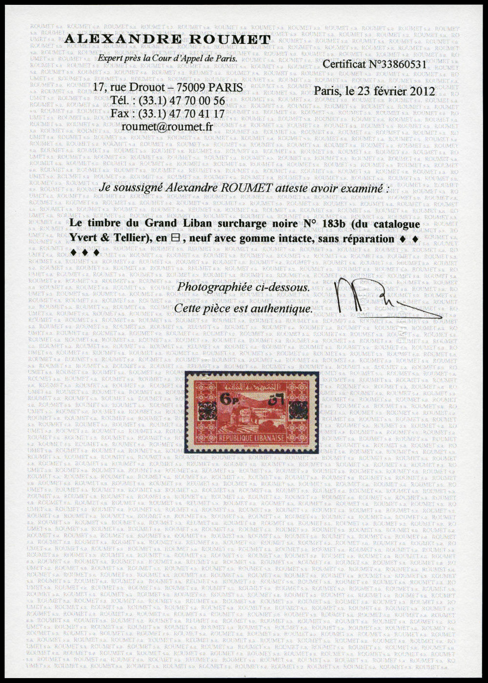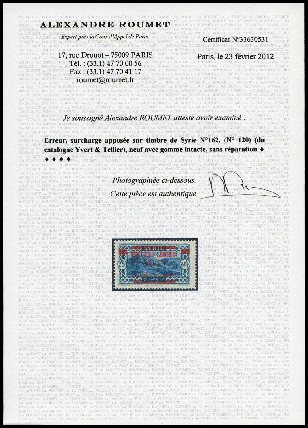 N°120, Erreur: Surcharge sur timbre n°162 de Syrie. TTB (certificat) Qualité: ** (Image) (imagea)