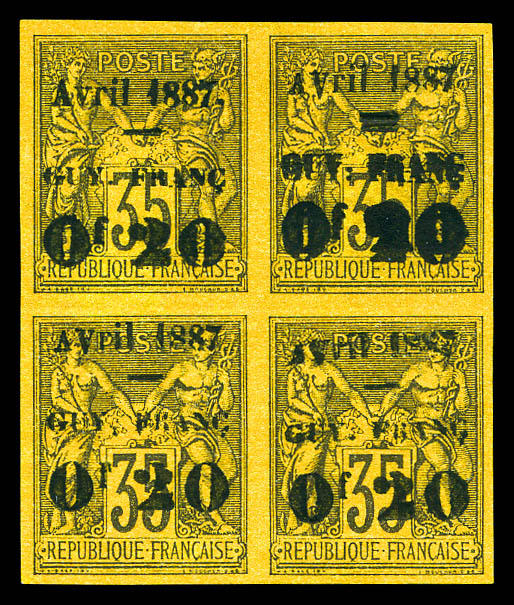 3358 ng imageN°4, 0f20 sur 35c: exemplaire Double surcharge tenant à 2 exemplaires avec Av renversé dans Avril tenant à normal en bloc de 4. SUP. R. (signé Bernichon/certificat) Qualité: (*) (Image)