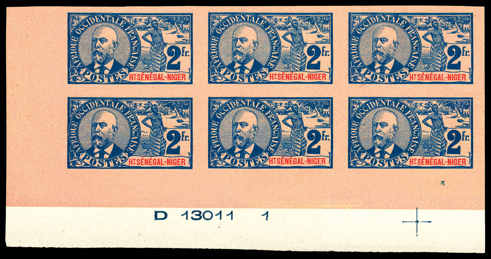 3390 ng imageN°16a, 2f bleu sur rose non dentelé, bloc de six cdf avec numéro et croix de repère. SUP. R. (certificat) Qualité: (*) Cote: 1050 euros (Image)