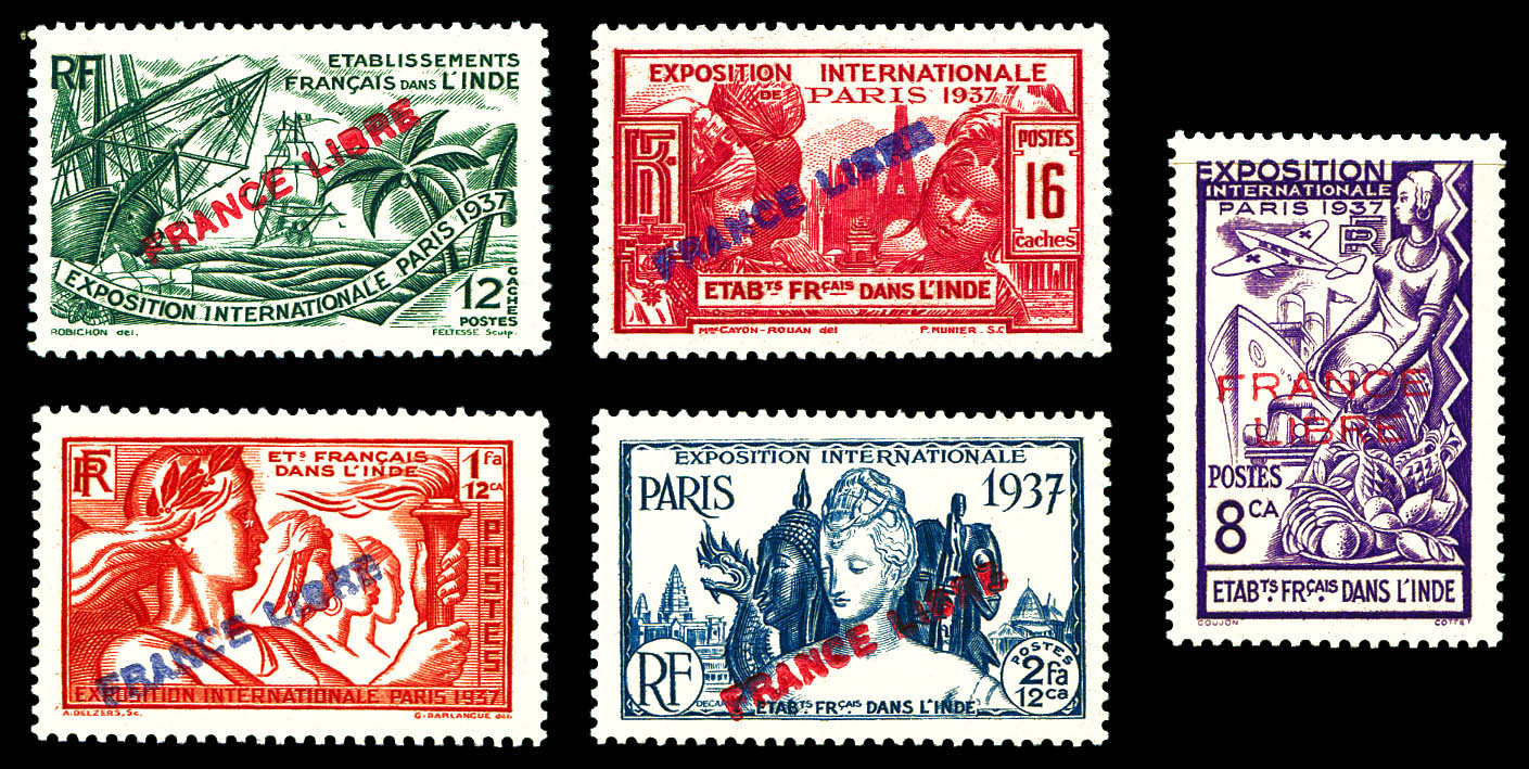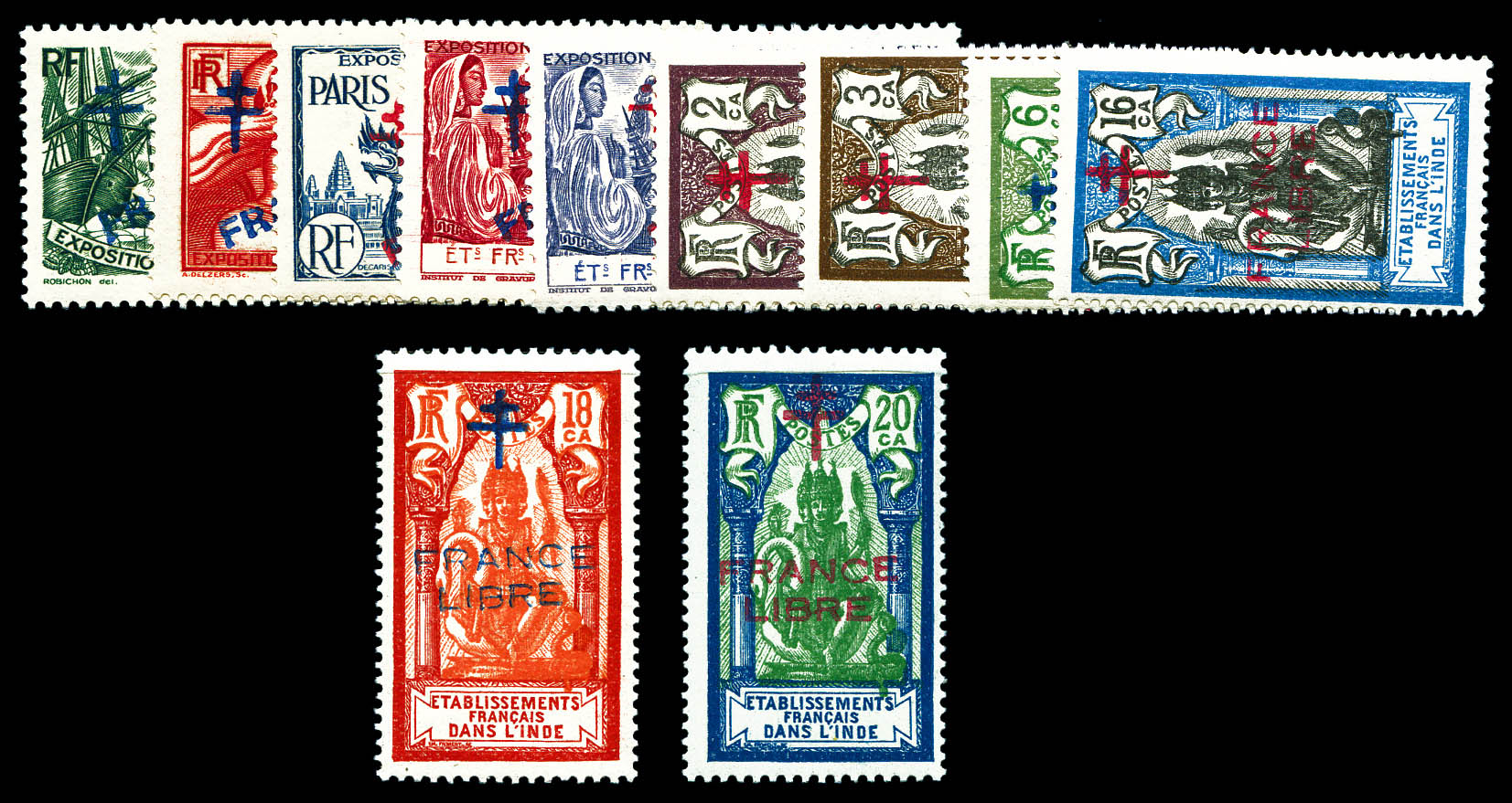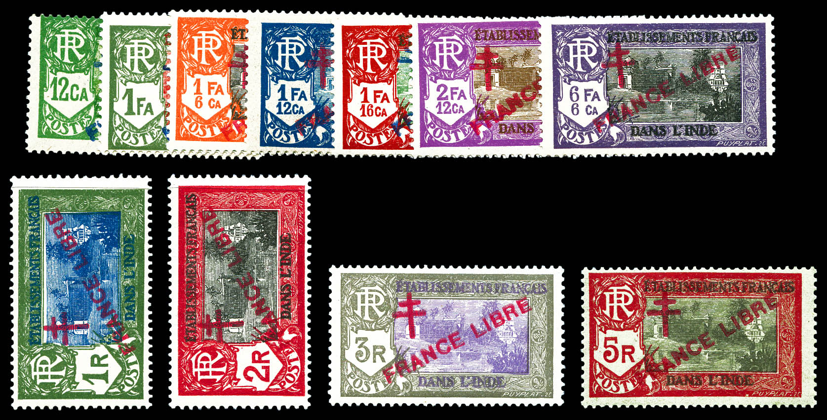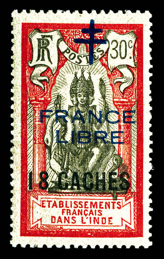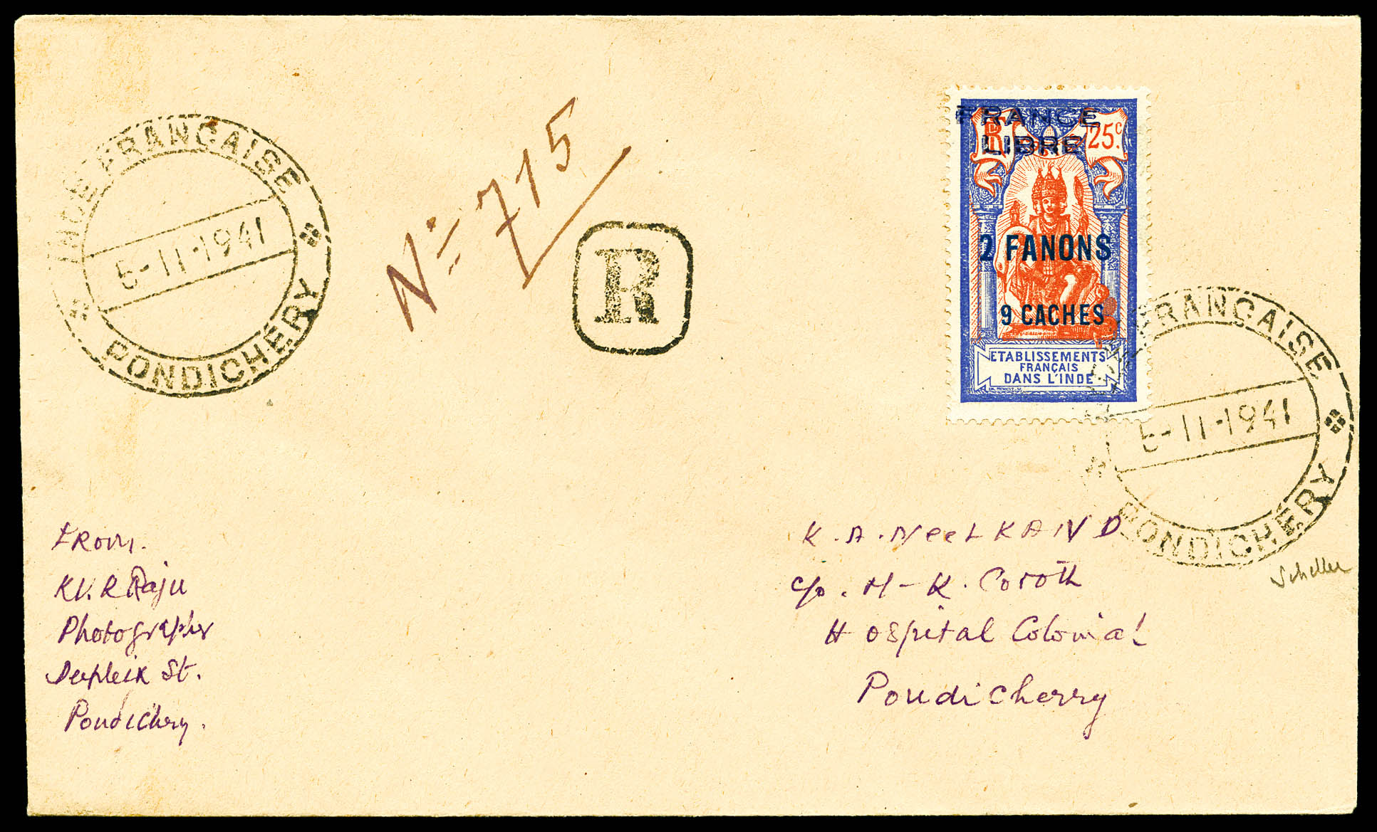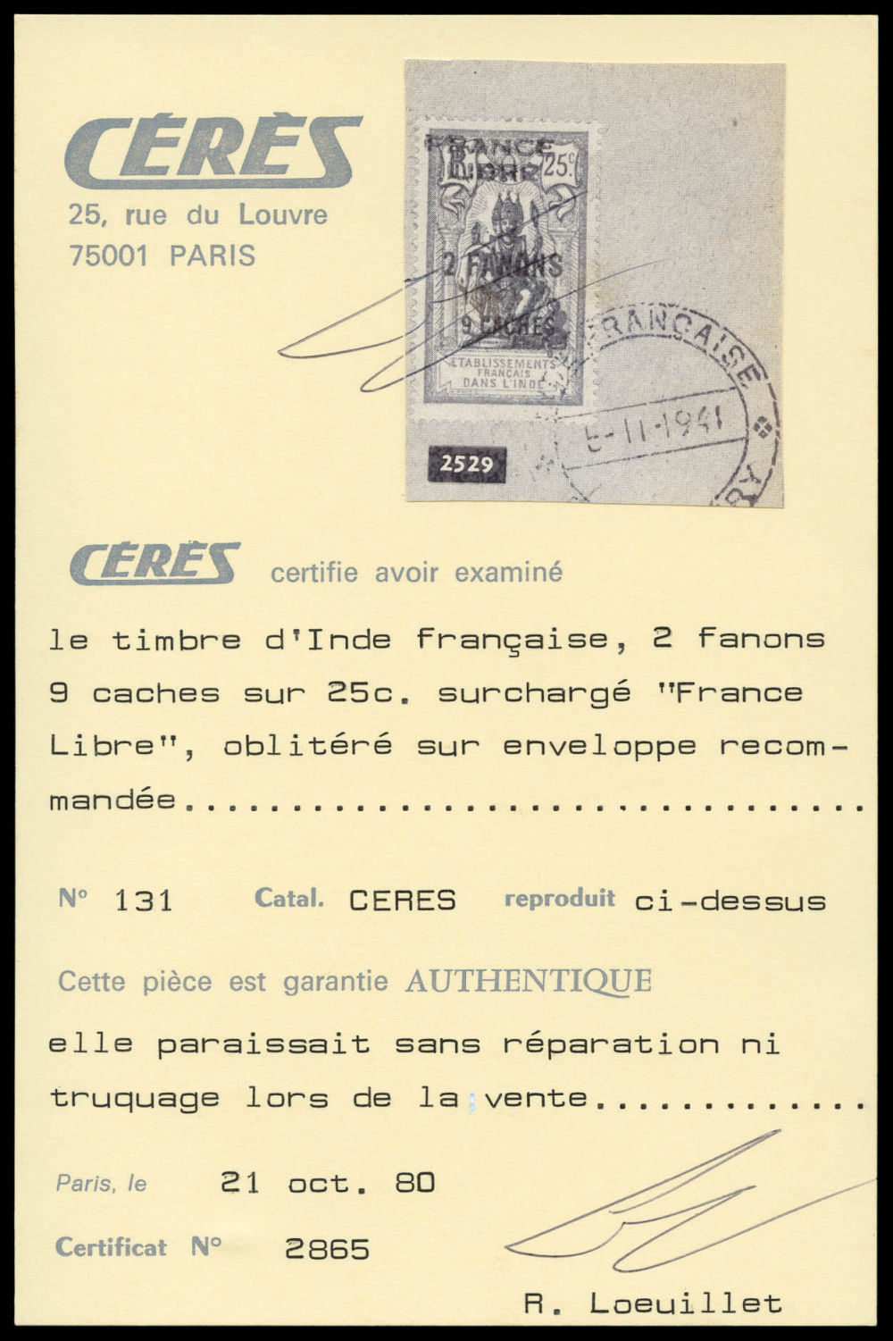N°131, 2 fa 9ca sur 25c outremer et rouge-orange surchargé 'FRANCE LIBRE' obl càd de PONDICHERY sur enveloppe recommandée. SUP. R.
